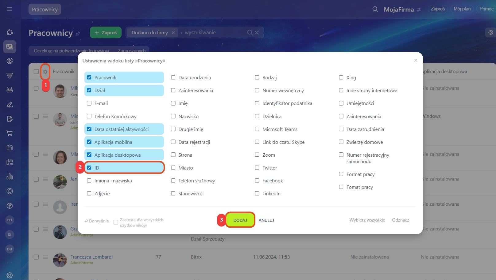 ID użytkownika można sprawdzić w jego profilu lub na liście pracowników.