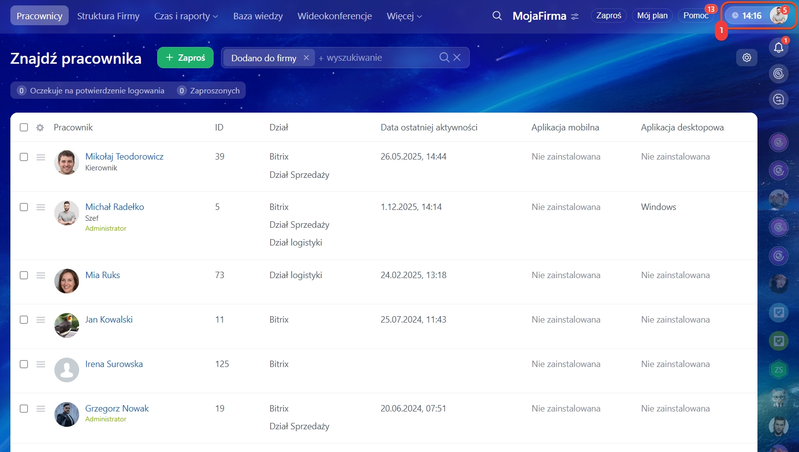 W profilu pracownika. Jeśli korzystasz z Bitrix24 w przeglądarce, otwórz profil pracownika — jego ID będzie widoczne w pasku adresu po /user/. Na przykład w linku https://testbitrix.pl/company/personal/user/1/ ID to 1.