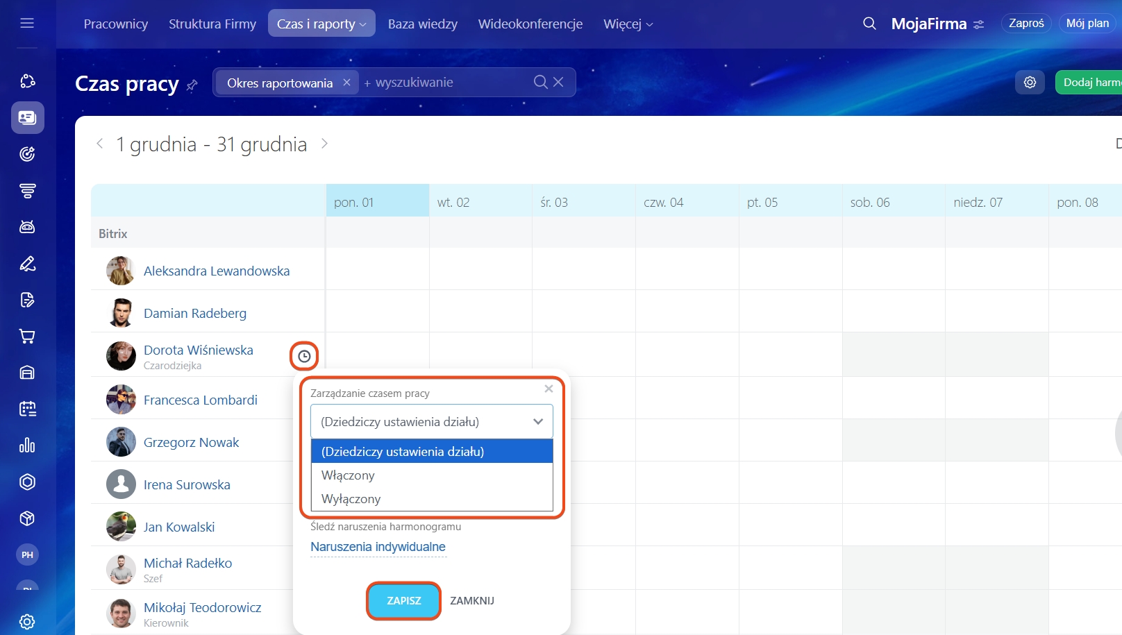 - Dziedzicz ustawienia działu — pracownik będzie korzystał z ustawień czasu pracy swojego działu. Opcja ta jest odpowiednia, jeśli ewidencja jest już włączona dla całego działu.