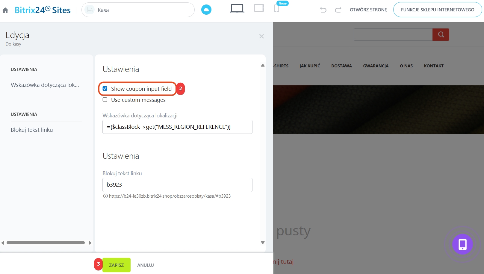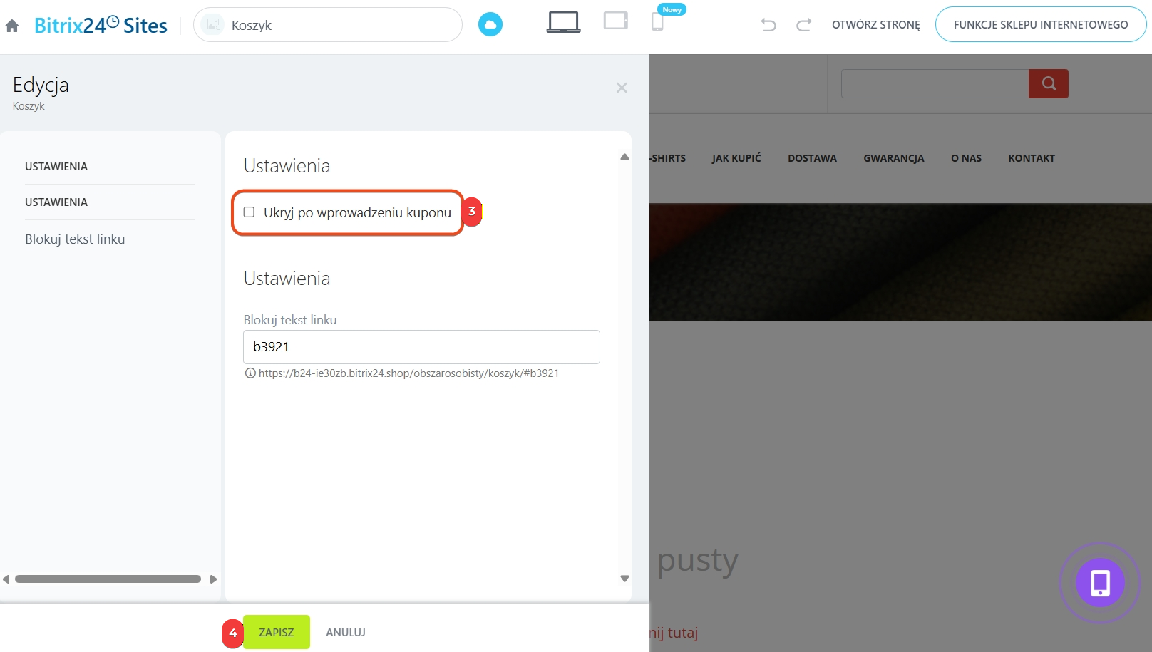 - W menu edycji bloku włącz opcję Ukryj pole na kupon i zapisz zmiany.