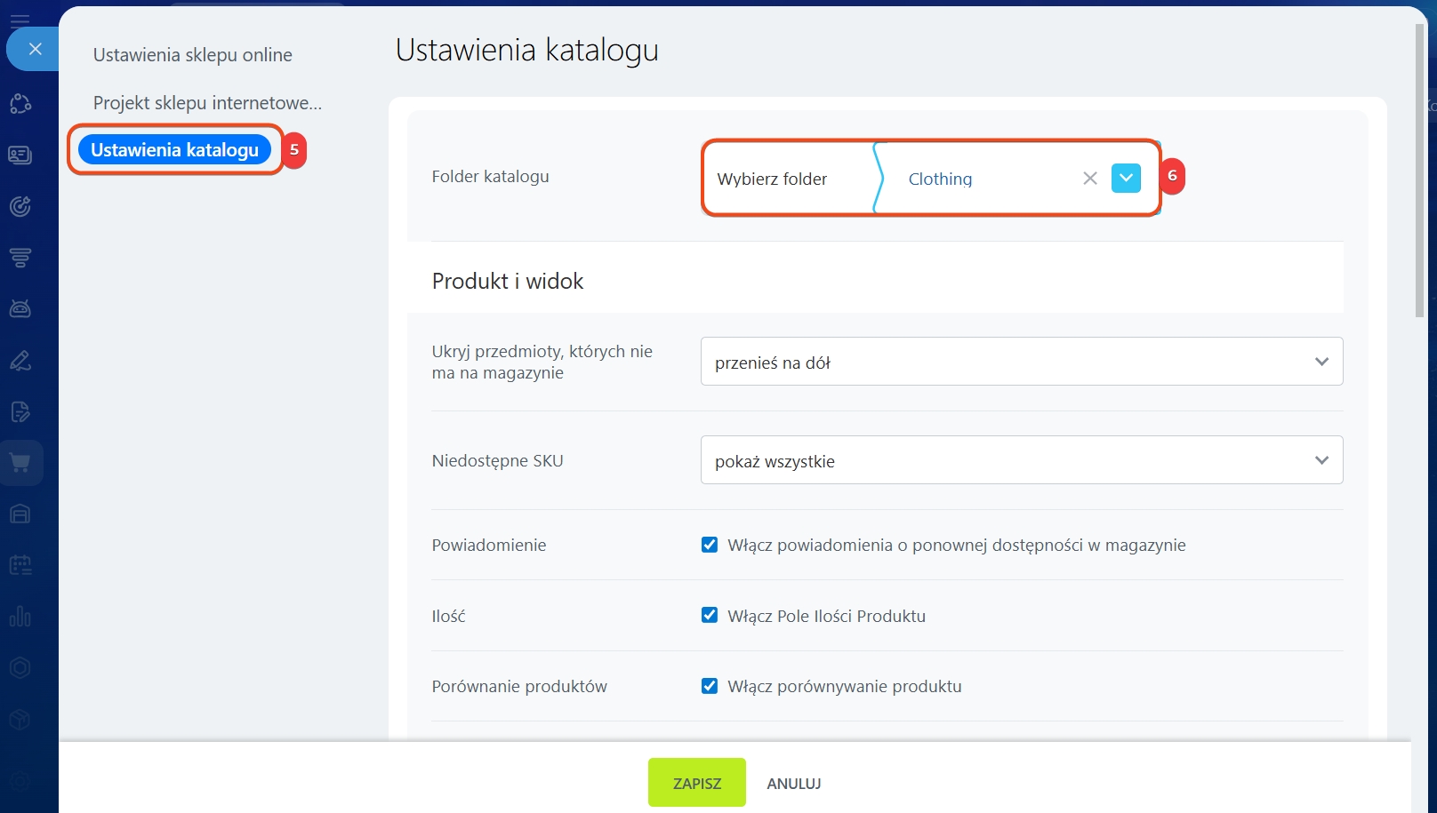 - Przejdź na kartę Ustawienia katalogu. W polu Sekcja katalogu wybierz dział z produktami.