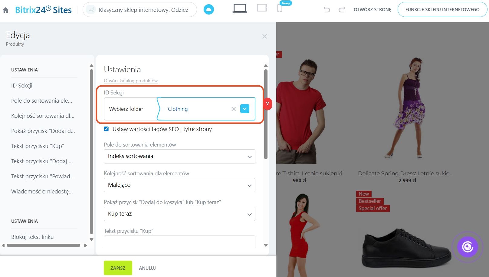 Inteligentny filtr działa poprawnie, jeśli w ustawieniach sklepu i w blokach z produktami wskazana jest ta sama sekcja katalogu. Jeśli w tych miejscach wybrane są różne sekcje, filtr będzie widoczny w edytorze, ale na opublikowanej stronie nie wyświetli się lub nie pokaże właściwości.