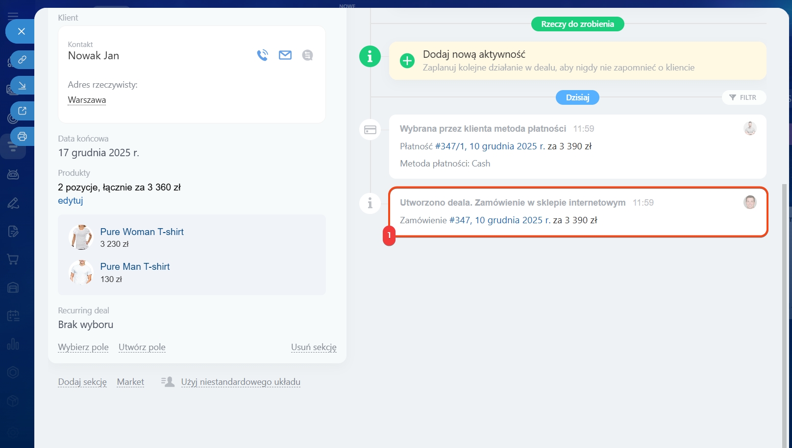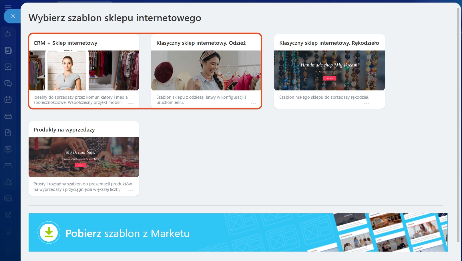 Podczas uruchamiania sklepu z szablonu „CRM + Sklep internetowy” lub „Sklep klasyczny. Odzież” Bitrix24 automatycznie tworzy dane demonstracyjne: produkty, sekcje katalogu i przykładowe ustawienia. Dzięki nim możesz zobaczyć, jak wygląda gotowy sklep, oraz przetestować proces zamówienia.