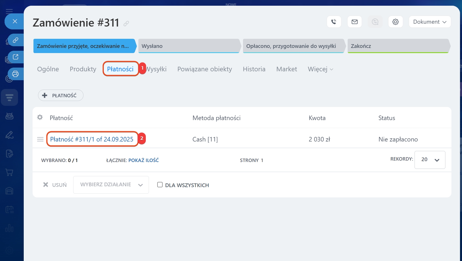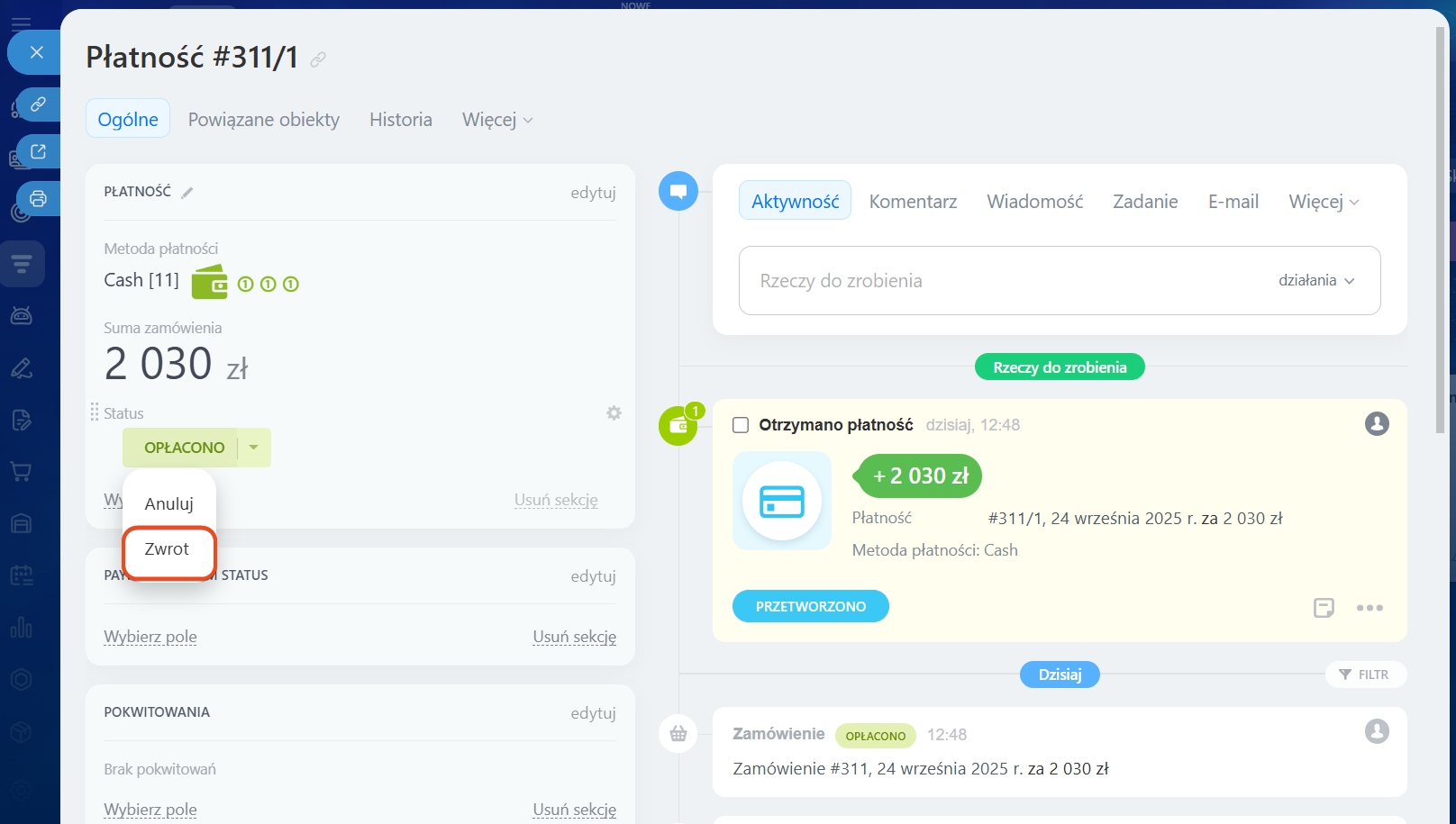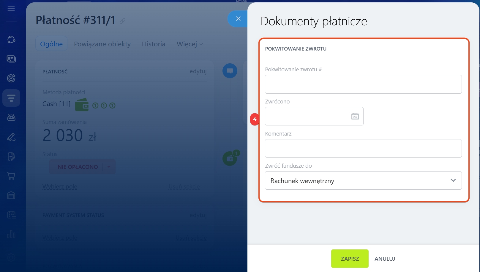 Przywróć płatność. W zamówieniu otwórz kartę Płatności i wybierz odpowiedni dokument. Ustaw status płatności Zwrot i wypełnij dane dokumentu zwrotu. Skonsultuj się z księgowością, jakie dane należy podać.