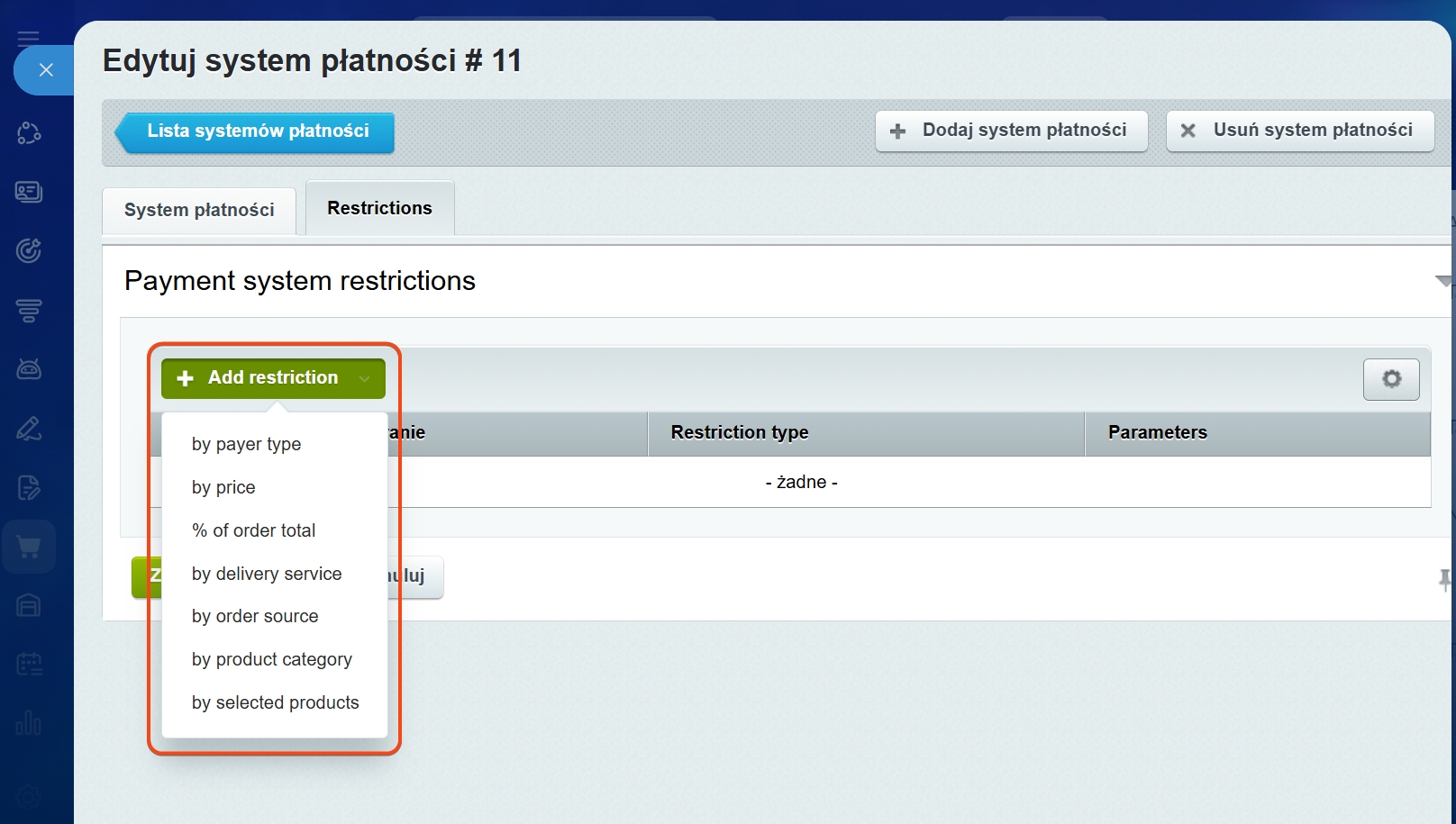 Ograniczenia systemów płatności pozwalają kontrolować, przy jakich warunkach klient będzie mógł wybrać określony sposób płatności. Jeśli warunki nie są spełnione, Bitrix24 ukryje daną metodę płatności podczas finalizacji zamówienia.