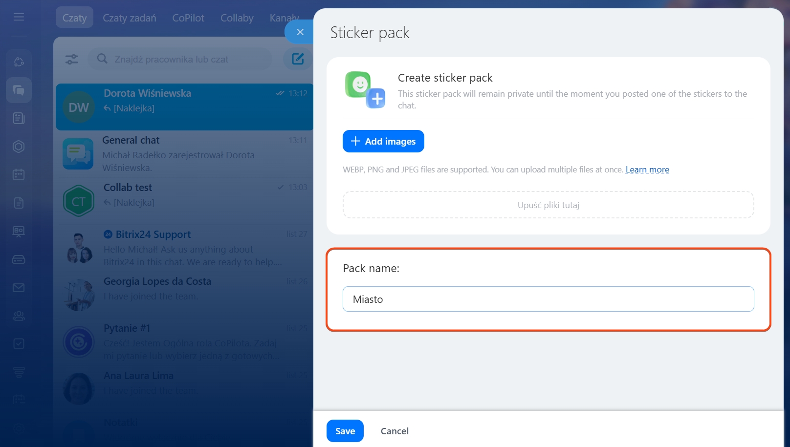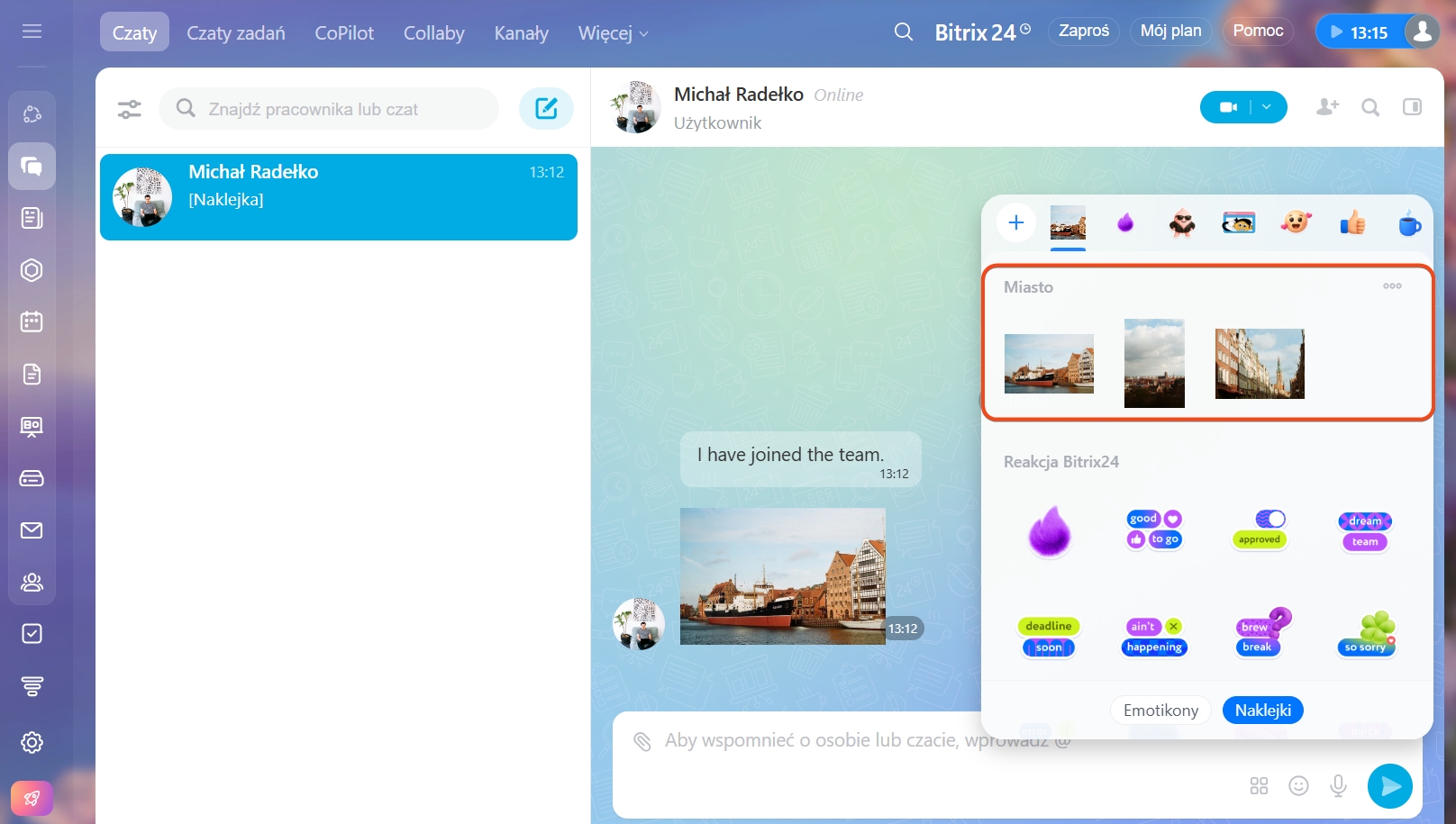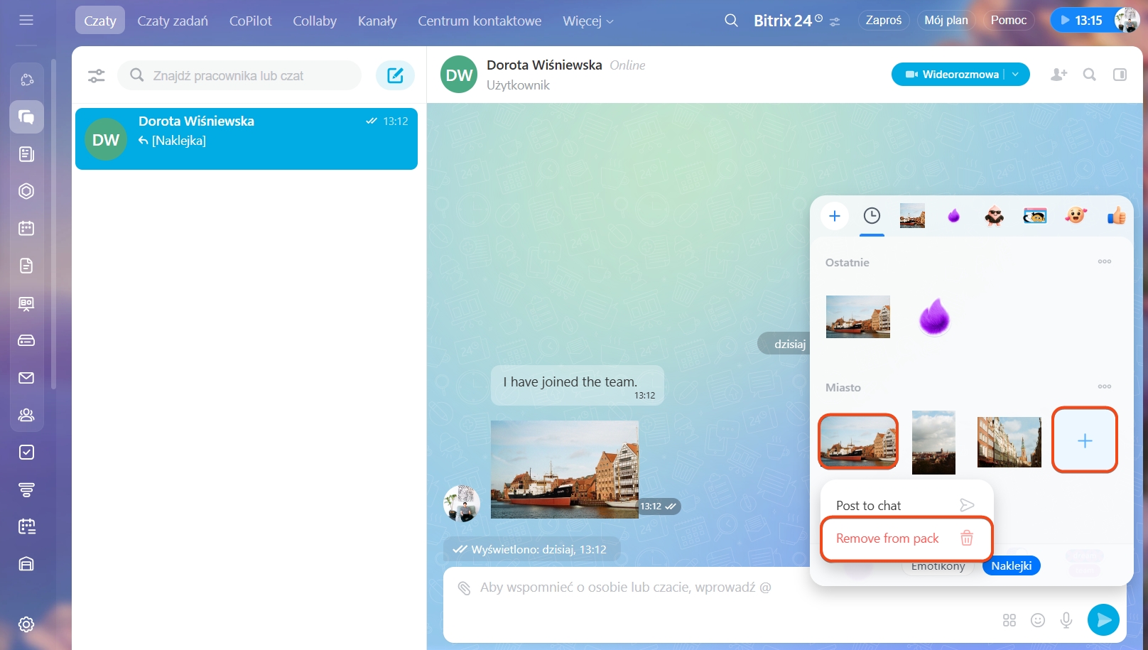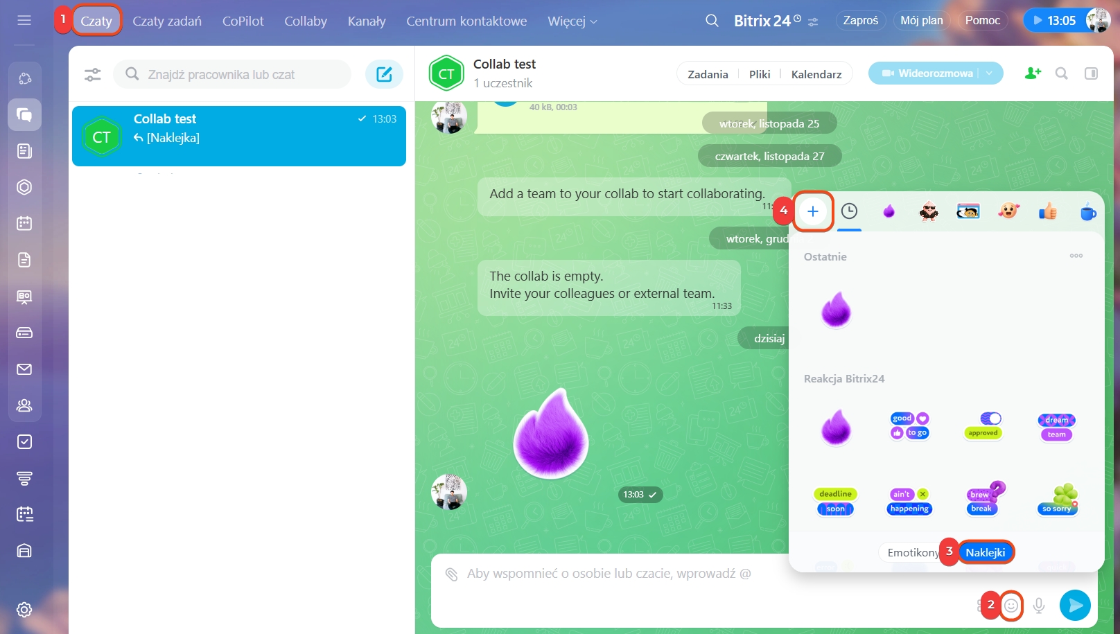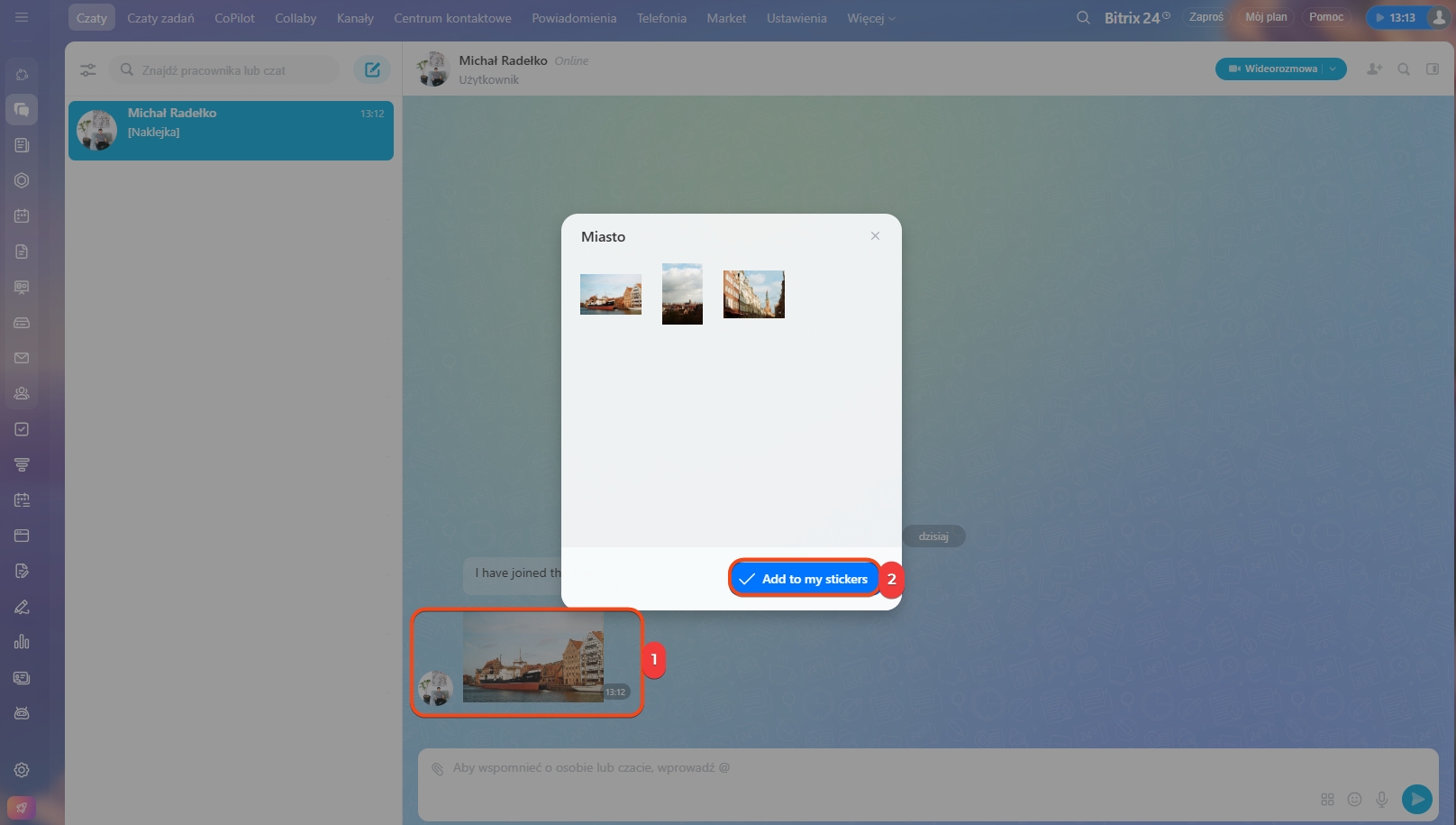 - W Bitrix24 możesz tworzyć własne zestawy naklejek. Po wysłaniu jednej naklejki na czat inni uczestnicy mogą dodać sobie cały zestaw.