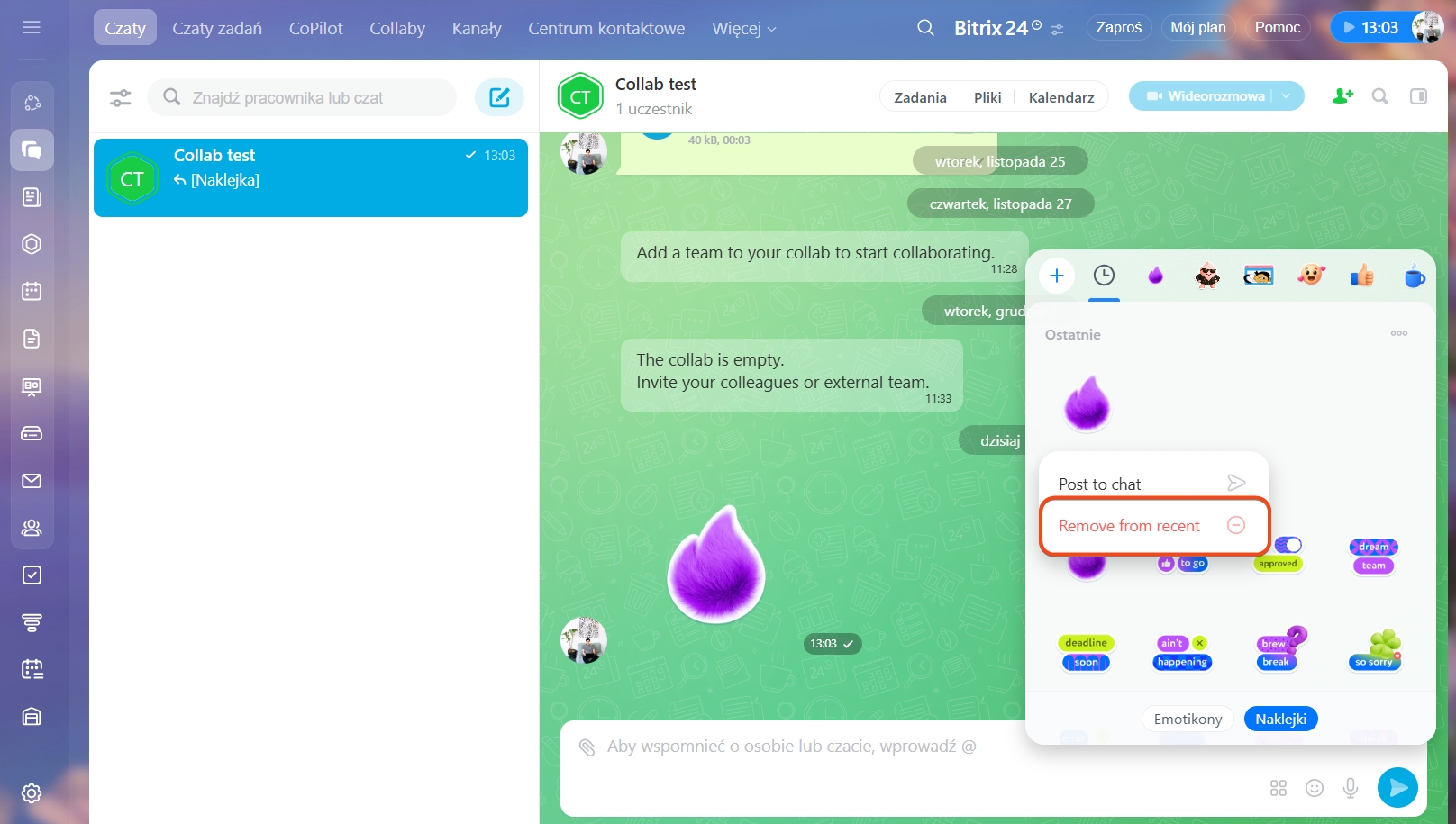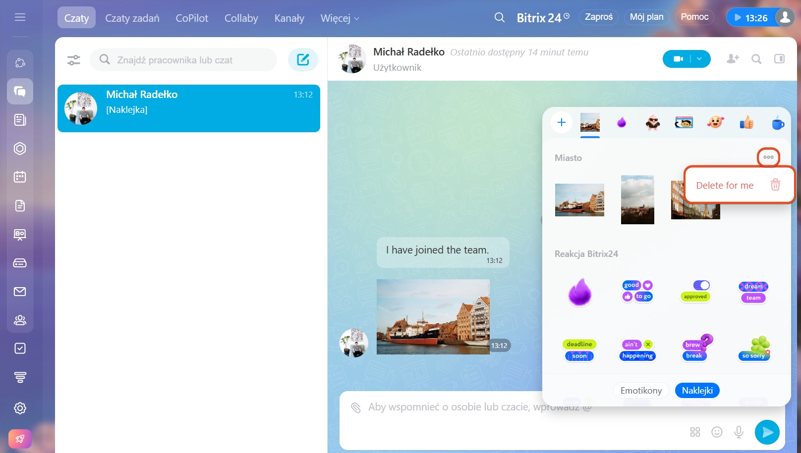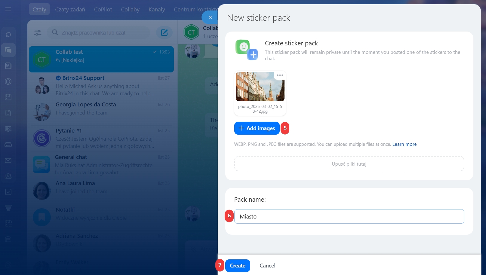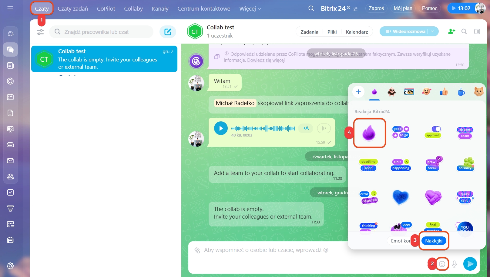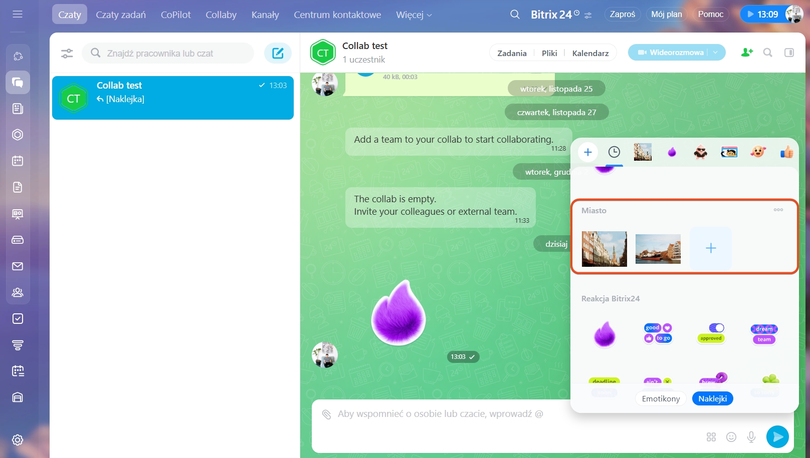 - W Bitrix24 możesz tworzyć własne zestawy naklejek. Po wysłaniu jednej naklejki na czat inni uczestnicy mogą dodać sobie cały zestaw.