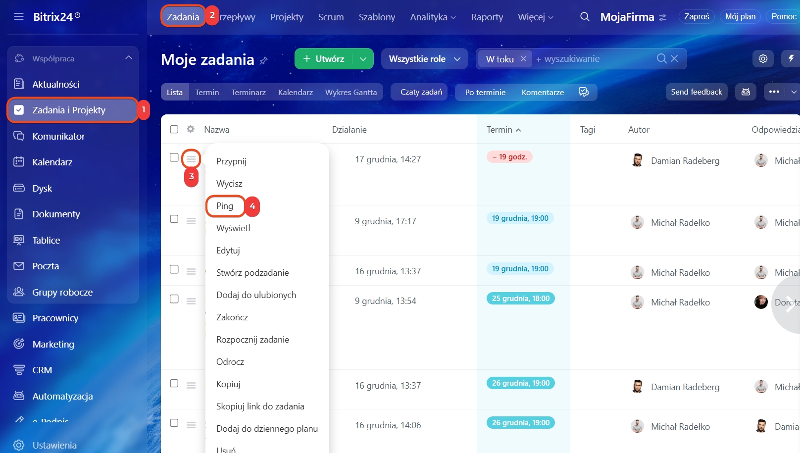 Przejdź do Zadania i projekty > Zadania, wybierz odpowiednie zadanie, otwórz Menu (≡) i kliknij Ping. Odpowiedzialny i uczestnicy otrzymają powiadomienie, że zapytałeś o status zadania. Na czacie zadania pojawi się komunikat systemowy.