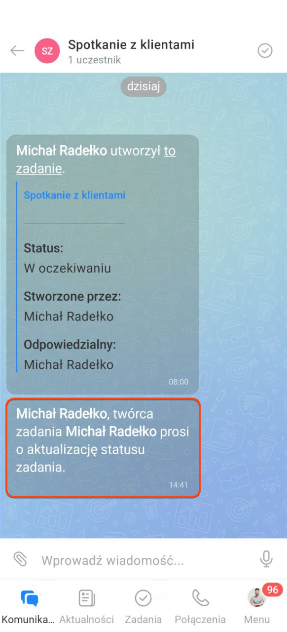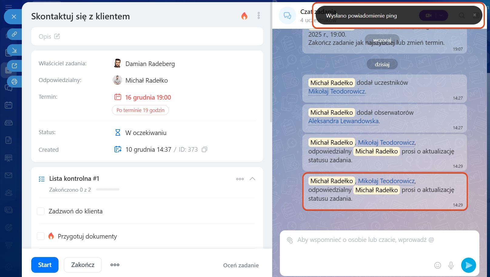 - Odpowiedzialny i uczestnicy otrzymują powiadomienie o pingu i widzą go jako komunikat systemowy na czacie zadania.