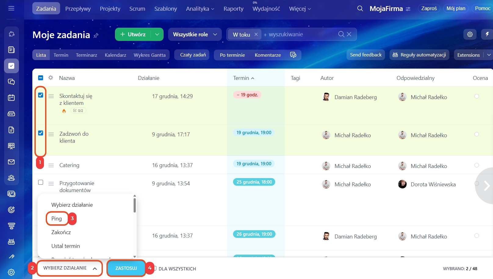 Jeśli zadań jest kilka, możesz zapytać o status wielu jednocześnie za pomocą działań grupowych. Na liście zaznacz wybrane zadania i kliknij Wybierz działanie > Ping > Zastosuj.