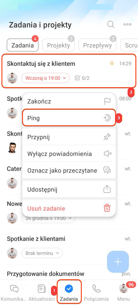 - Wysłać ping możesz z listy zadań: w wersji webowej – przez menu zadania, w aplikacji mobilnej – przytrzymując palcem zadanie.