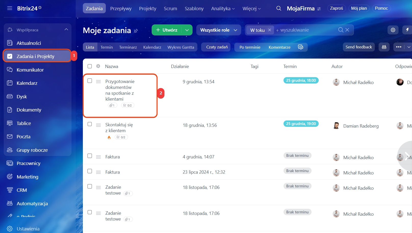 1–2. Przejdź do Zadania i projekty, utwórz nowe zadanie lub otwórz potrzebne.