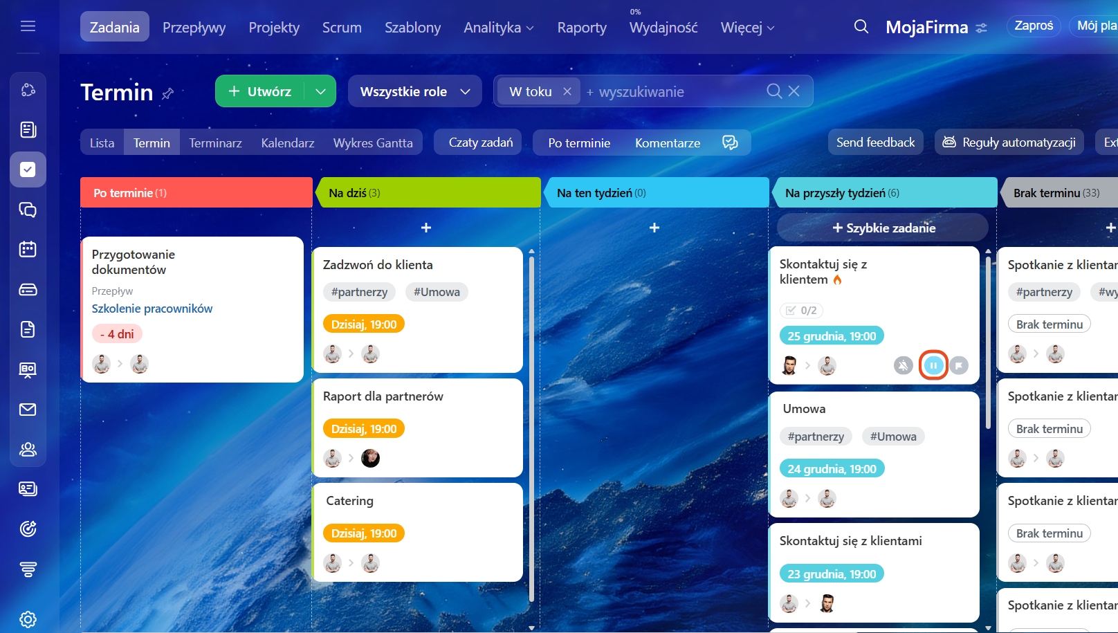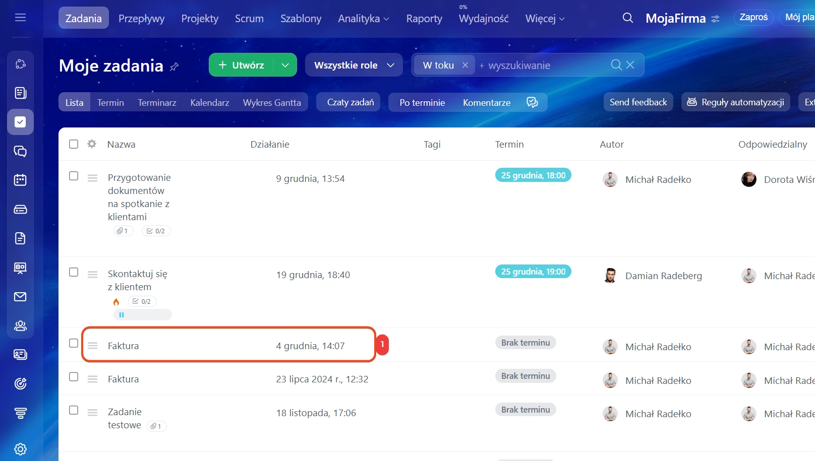 Z listy zadań. Uruchomić i wstrzymać śledzenie czasu możesz w widokach Terminy, Lista i Mój plan. To wygodne, gdy już pracujesz nad zadaniem i chcesz włączyć timer bez otwierania formularza.