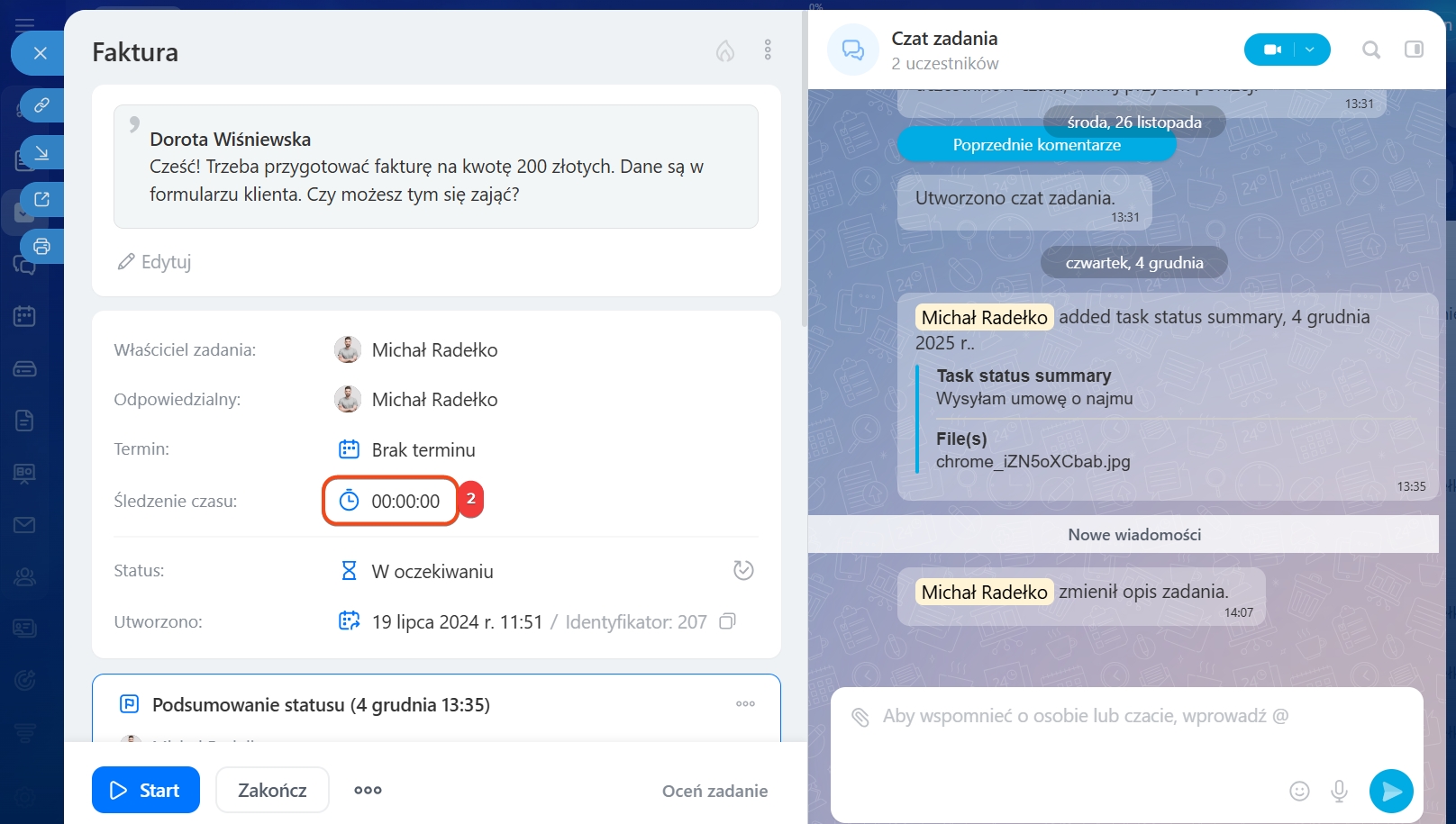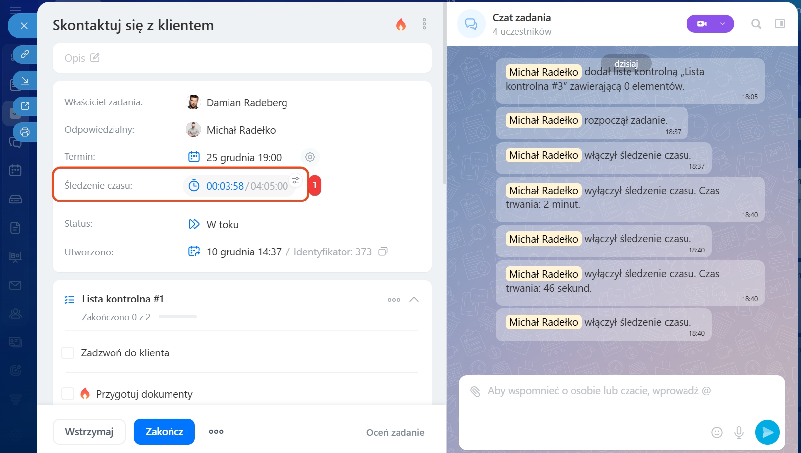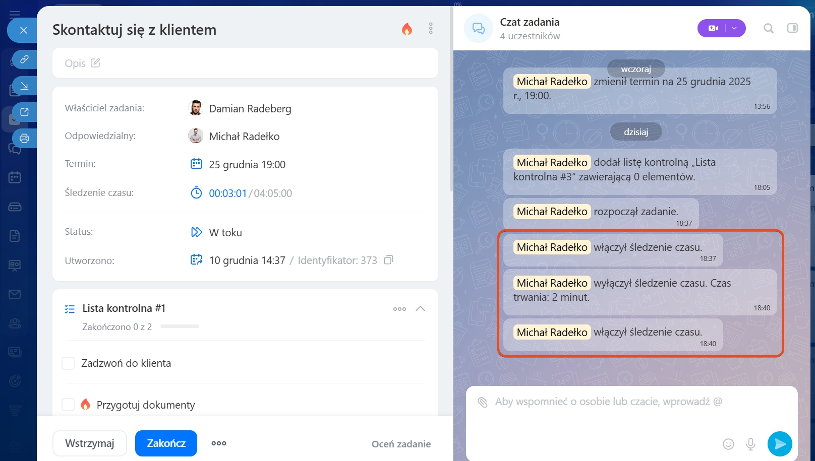 Na czacie zadania w postaci komunikatów systemowych. Gdy uczestnik uruchomi timer, na czacie pojawi się wiadomość: „Pracownik włączył śledzenie swojego czasu pracy nad zadaniem”. Przy wstrzymaniu wysyłana jest wiadomość z podaniem czasu spędzonego na zadaniu w tym okresie.