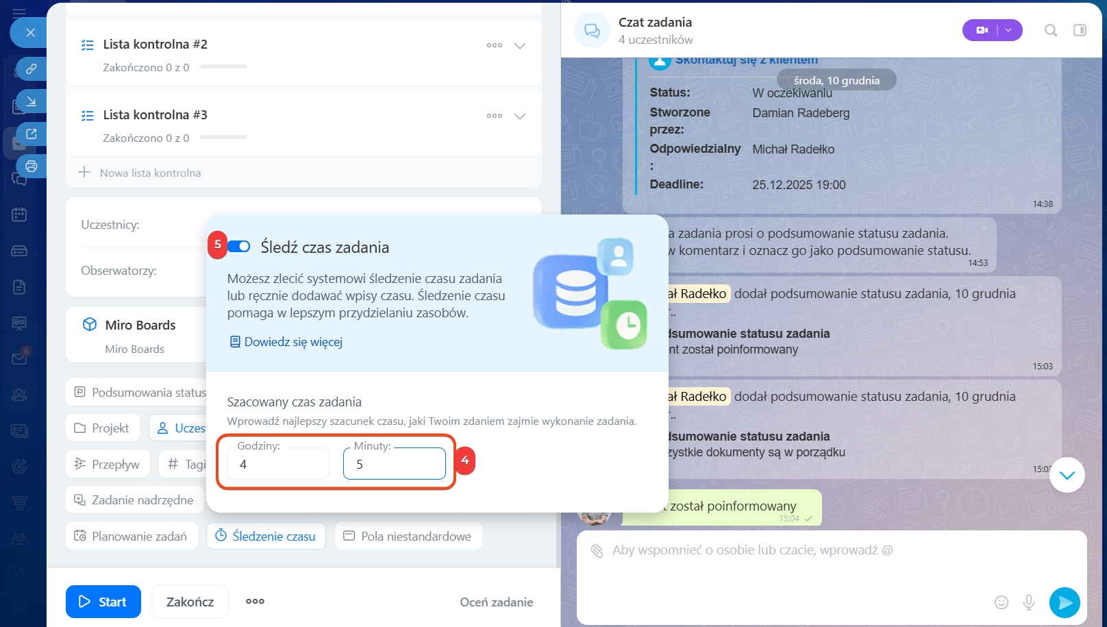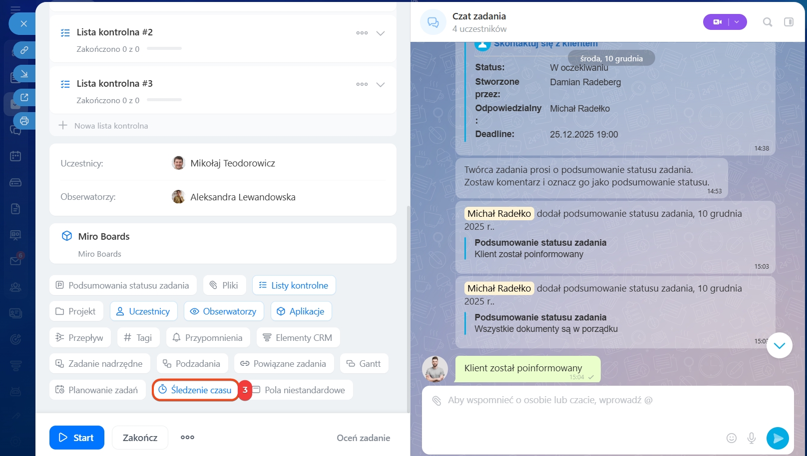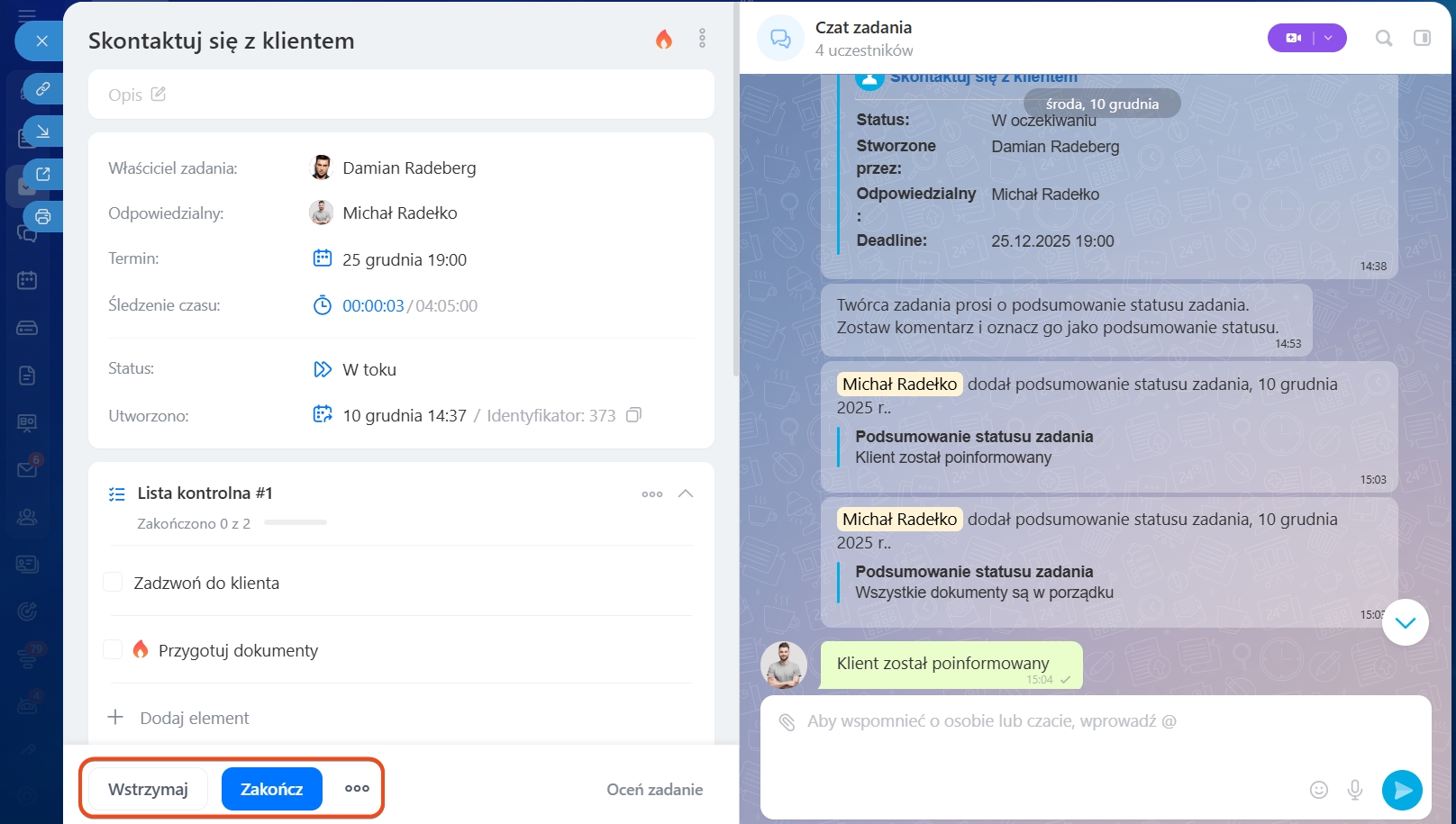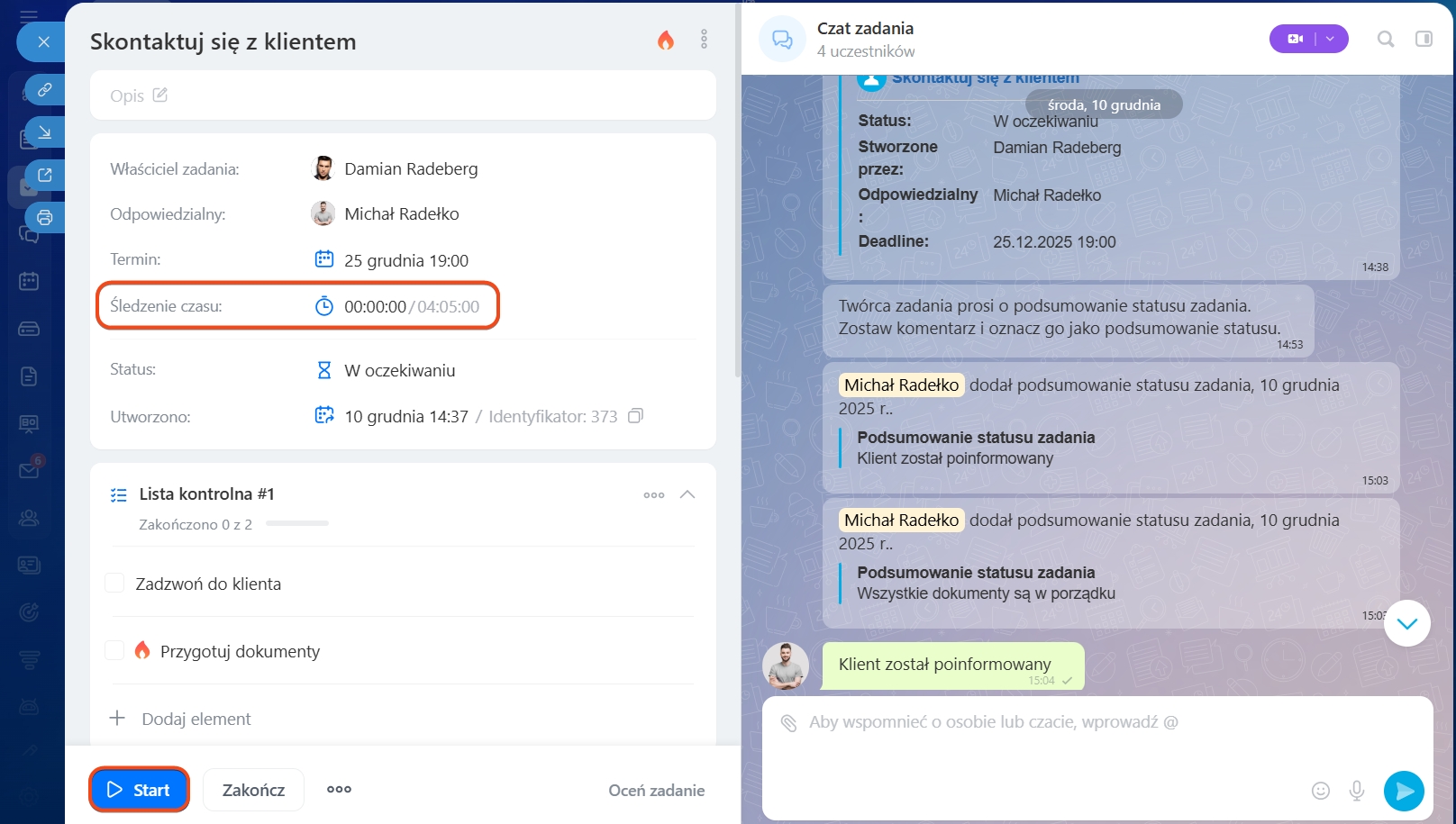 Na czacie zadania w postaci komunikatów systemowych. Gdy uczestnik uruchomi timer, na czacie pojawi się wiadomość: „Pracownik włączył śledzenie swojego czasu pracy nad zadaniem”. Przy wstrzymaniu wysyłana jest wiadomość z podaniem czasu spędzonego na zadaniu w tym okresie.