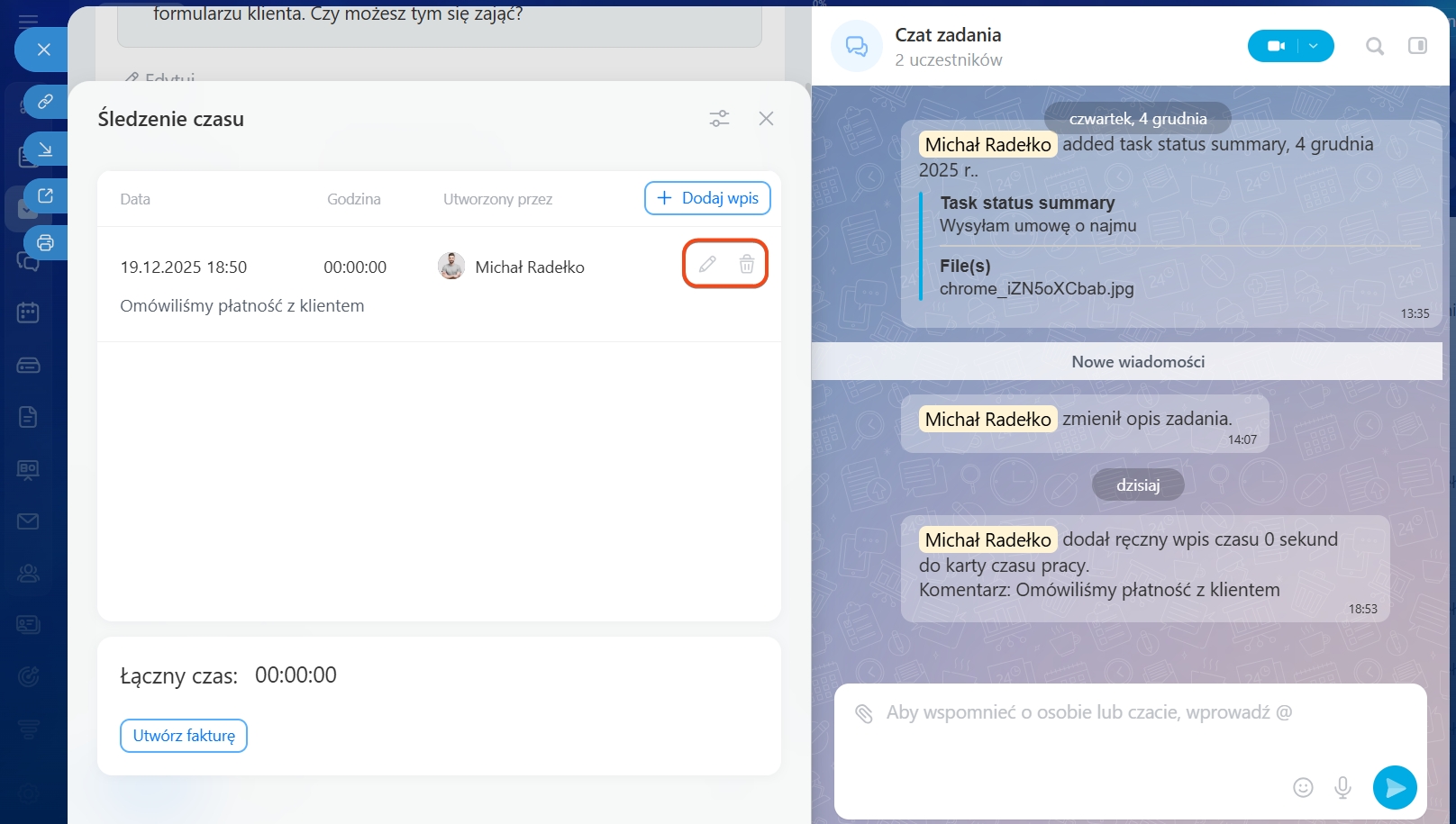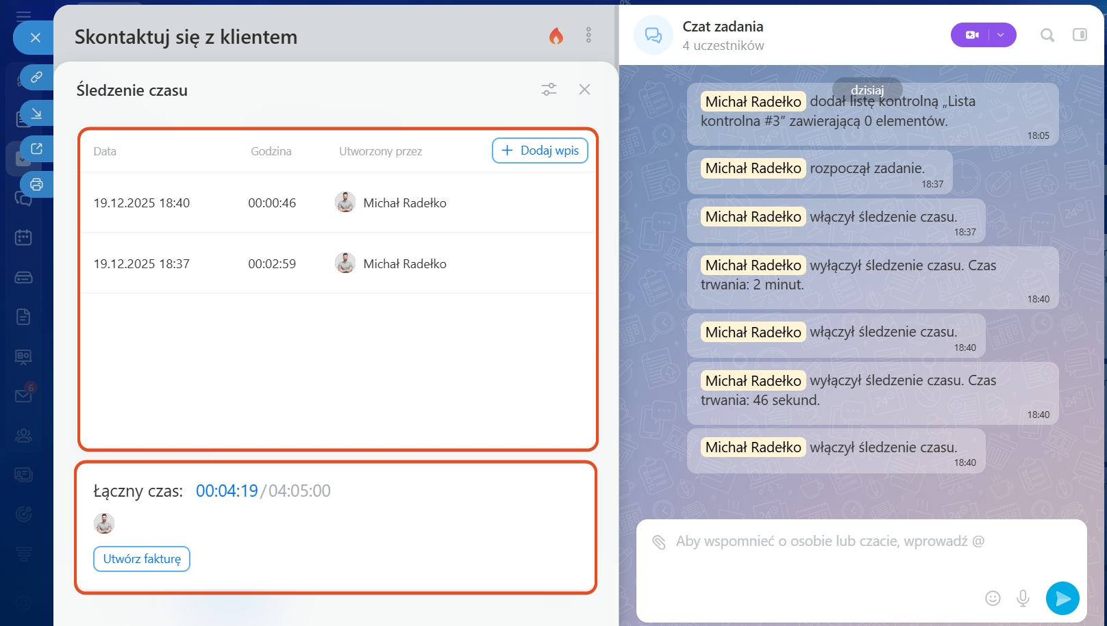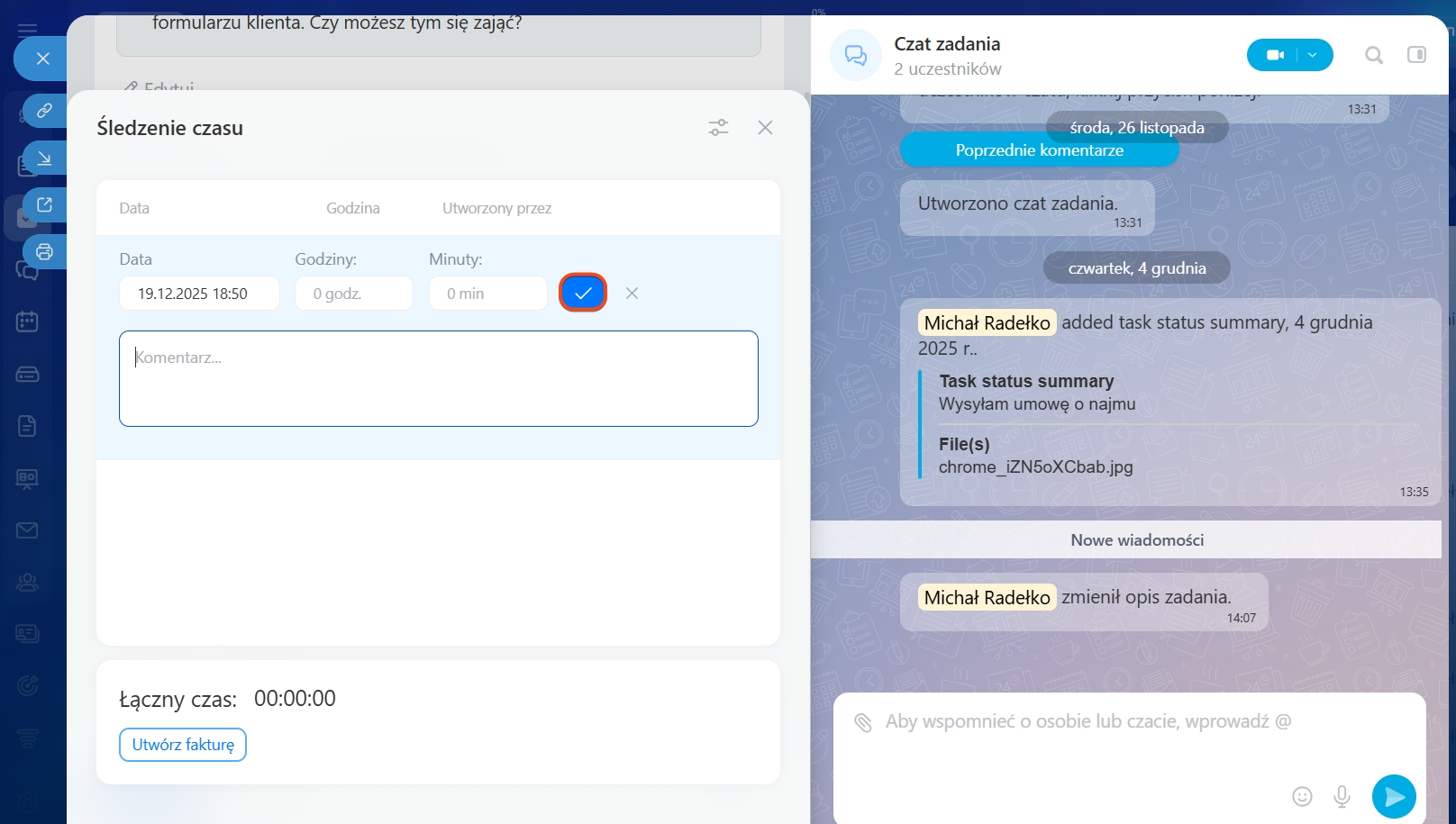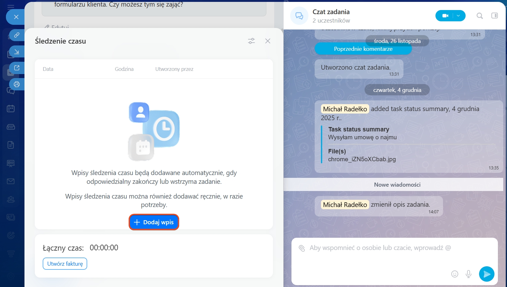 Historia śledzenia czasu pokazuje, kto, kiedy i jak długo pracował nad zadaniem. Zapisy możesz zobaczyć na czacie zadania lub w jego formularzu.