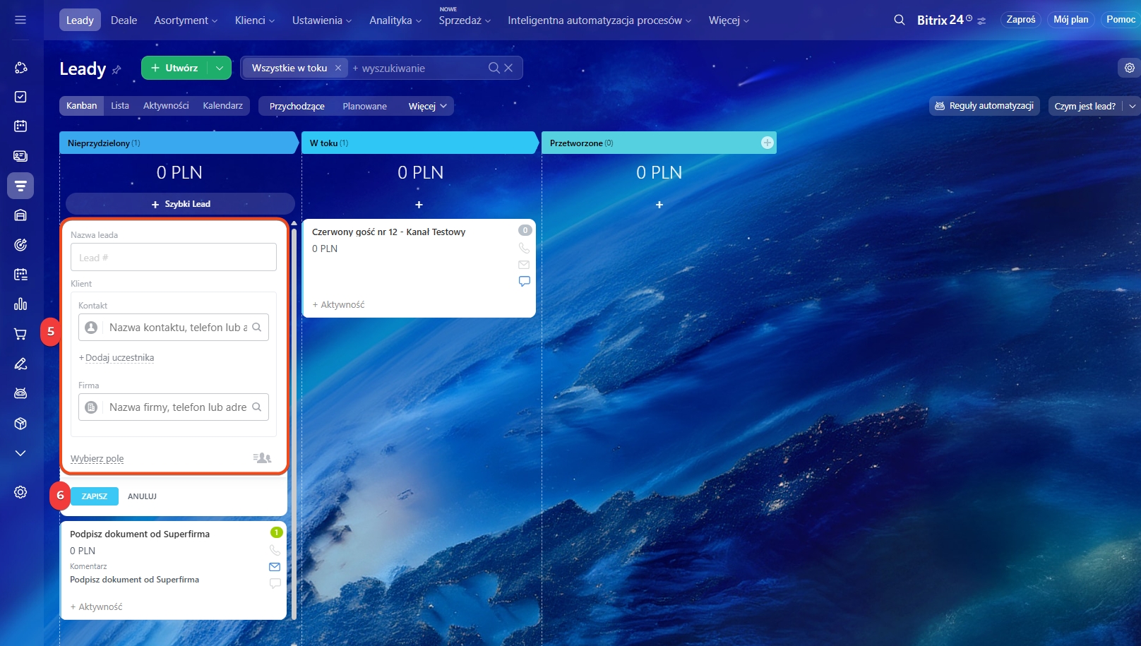 1–3. Przejdź do CRM → Leady → Kanban.
