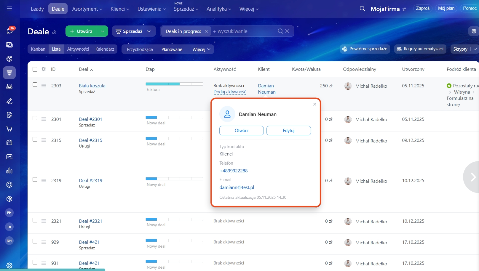 Kontakt z klientem. Aby szybko zobaczyć dane kontaktowe, napisać wiadomość lub zadzwonić – najedź kursorem na imię klienta. Pojawi się mini-karta CRM z najważniejszymi informacjami: typ klienta, firma, telefon, e-mail. Stąd możesz też przejść do pełnego formularza klienta.