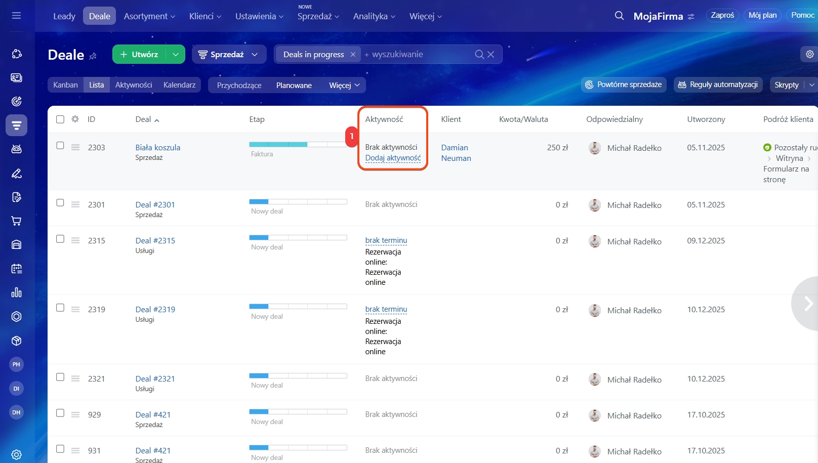 Dodanie aktywności. W kolumnie Aktywności możesz bardzo szybko zaplanować nowe działanie bezpośrednio z listy.