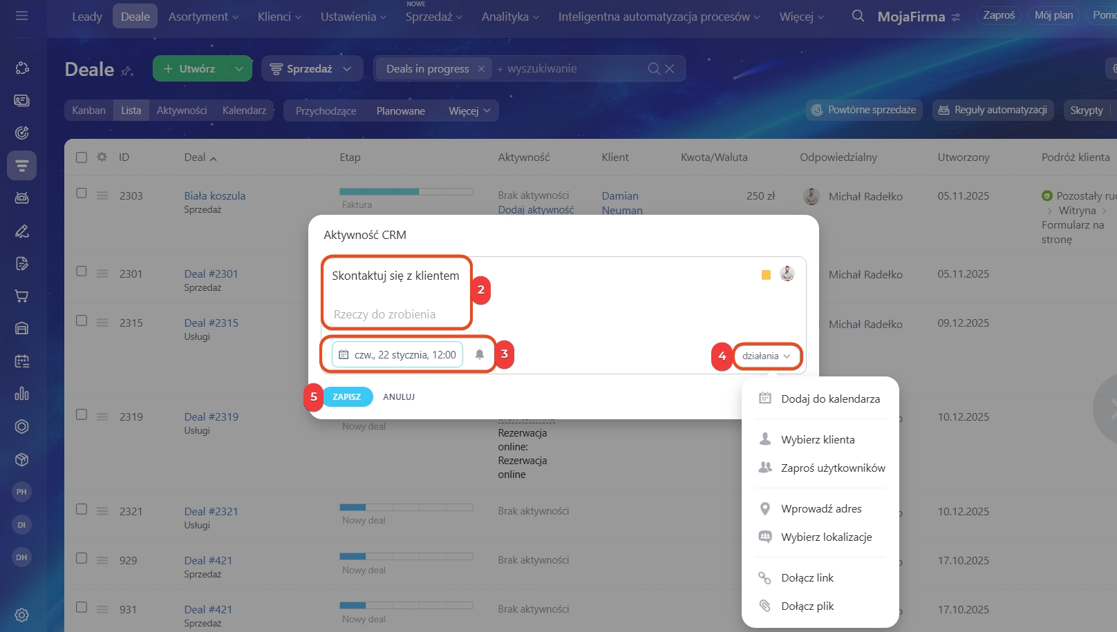Przykład: klient prosi o wystawienie faktury → menedżer otwiera menu, wybiera Zaplanuj > Aktywność i wpisuje „Przygotować fakturę”. Pozycja od razu pojawi się w aktywnościach.