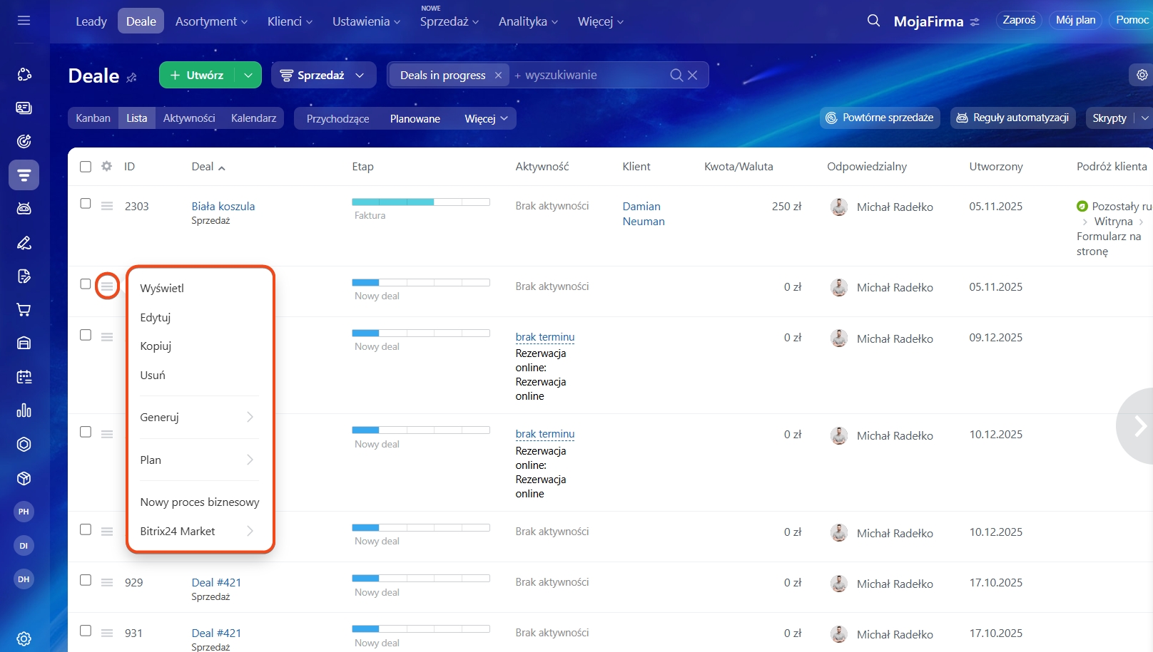 Dodatkowe działania z dealem. Dla każdego deala na liście dostępne jest menu z dodatkowymi możliwościami.