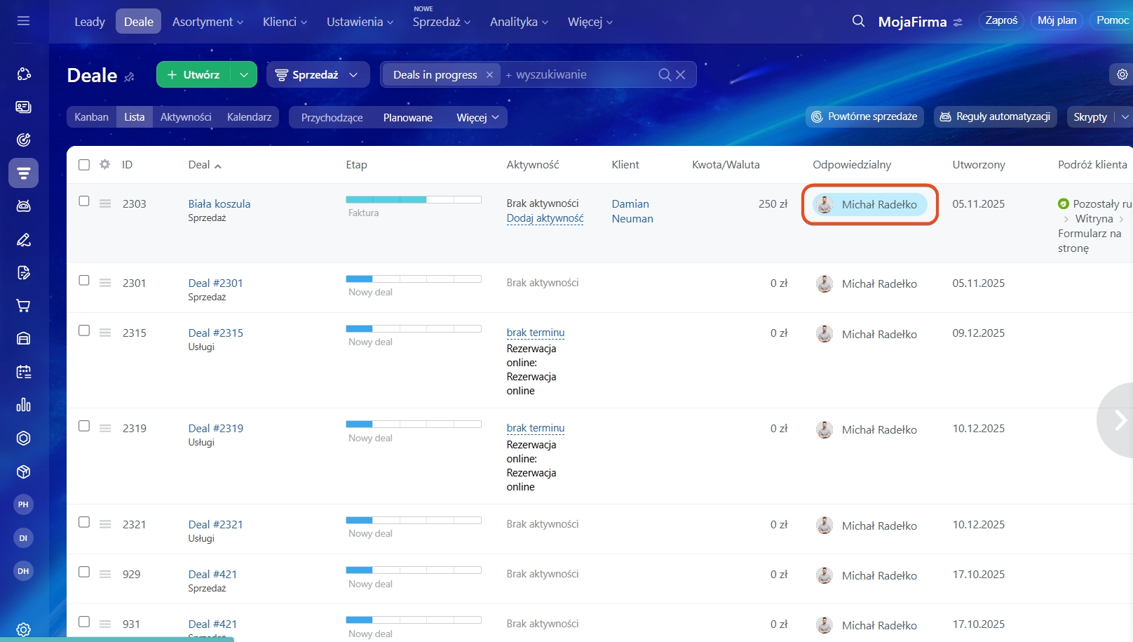 Korzystanie z filtra. Gdy deali jest dużo, filtry pozwalają bardzo szybko znaleźć potrzebne informacje. Wystarczy np. kliknąć imię odpowiedzialnego, a CRM pokaże od razu wszystkie deale przypisane do tej osoby.