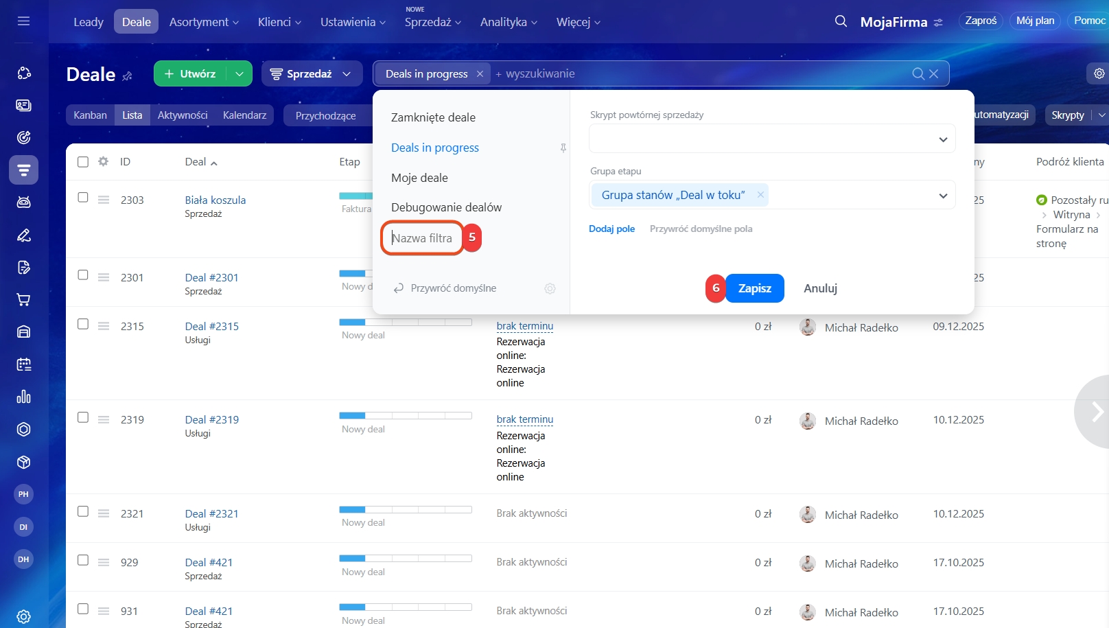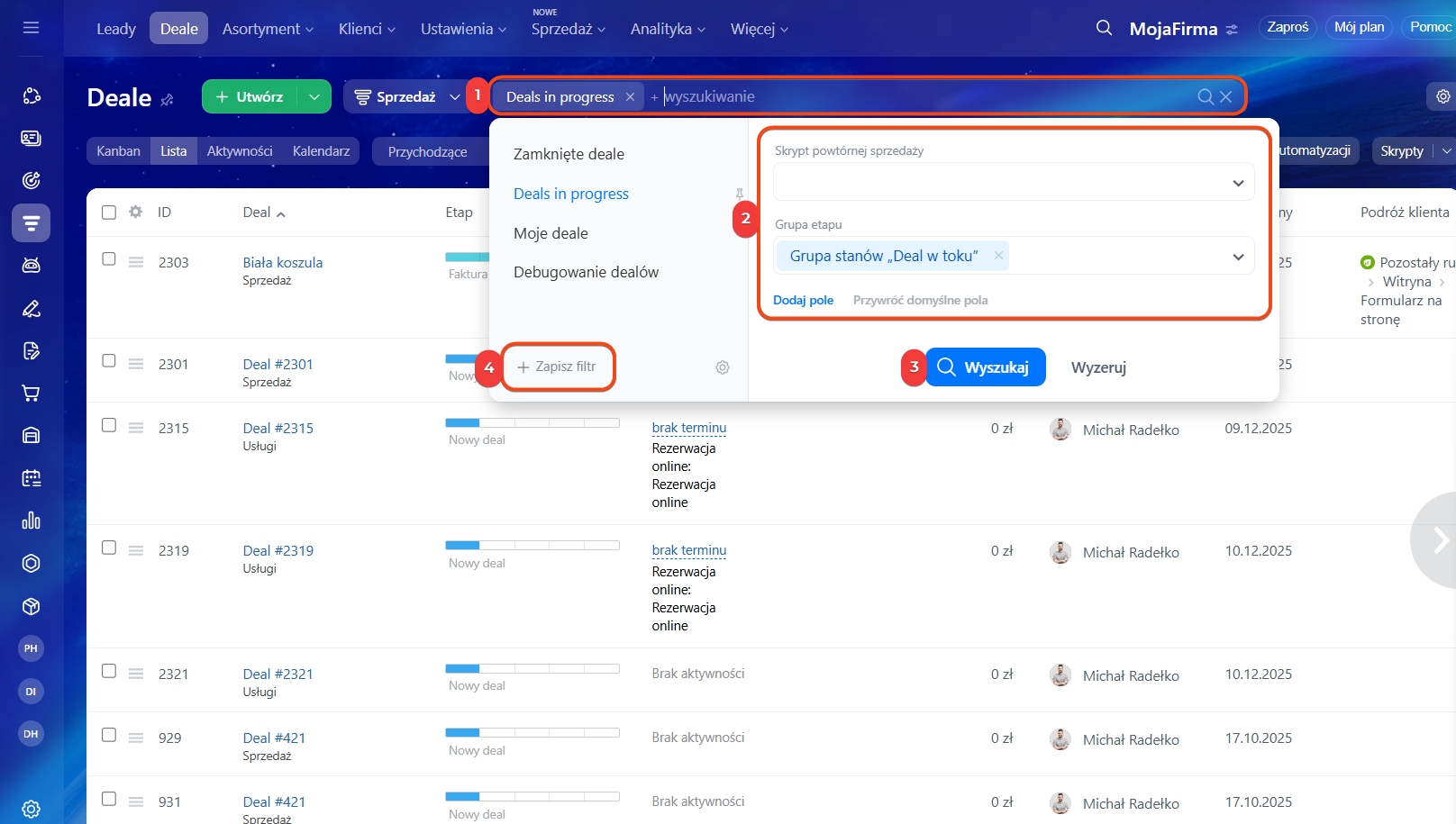 2. Wybierz warunki – CRM pokaże tylko pasujące deale. Na przykład kierownik wybiera etap Na uzgodnieniu i od razu widzi wszystkie deale wymagające uwagi.