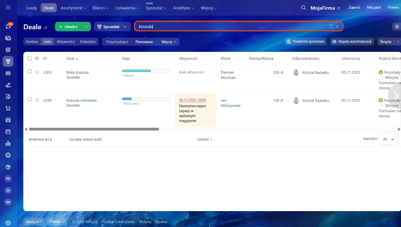 Wyszukiwanie. Gdy potrzebujesz szybko znaleźć konkretny deal lub klienta – skorzystaj z pola wyszukiwania nad tabelą. Wpisz nazwę deala, imię klienta lub dowolny fragment – CRM pokaże pasujące wyniki.