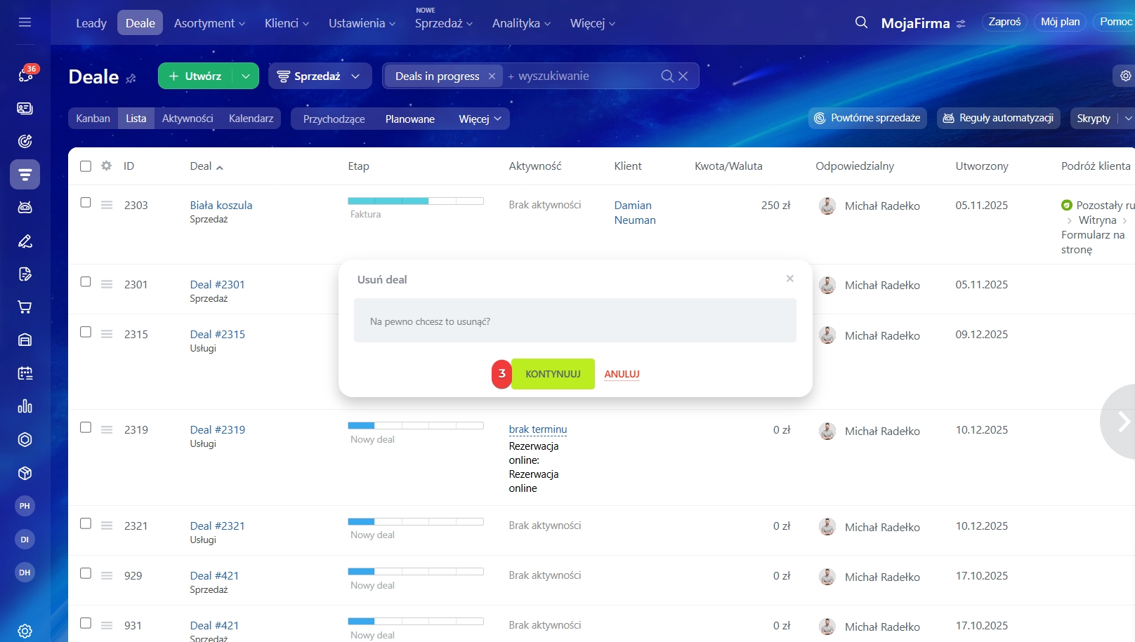 Usuwanie deala. Na liście możesz usunąć pojedynczy deal albo od razu kilka.