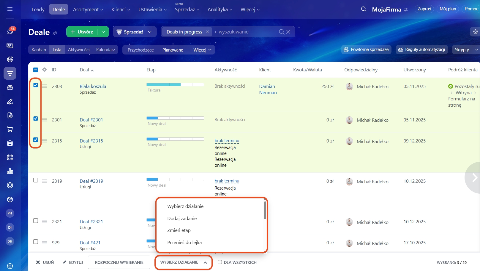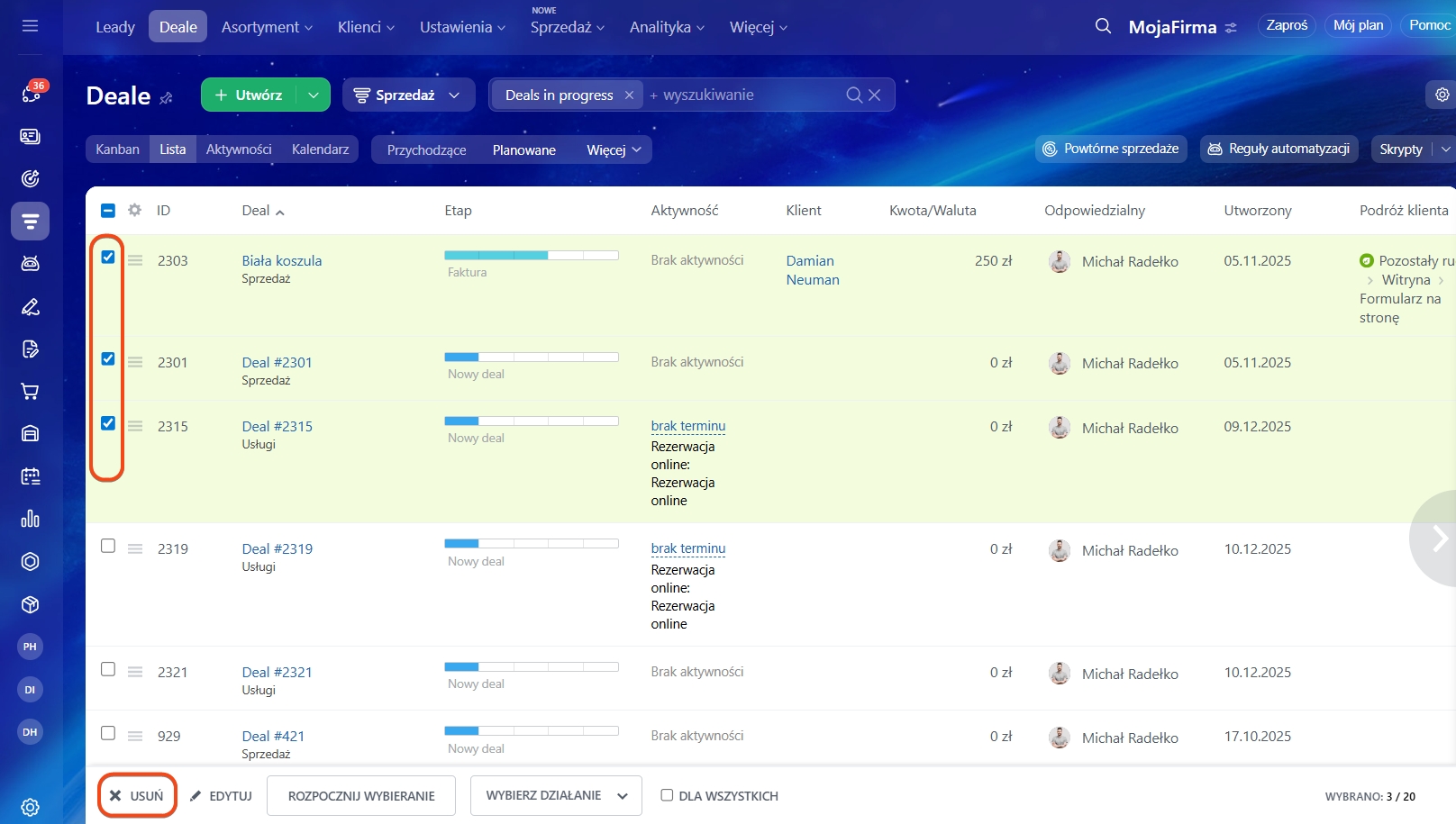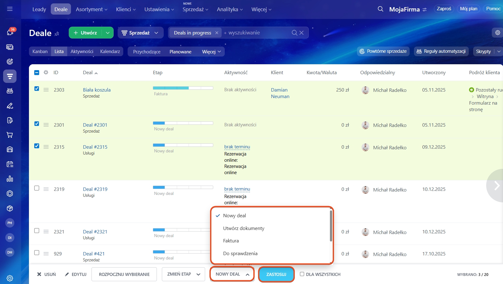 - Możesz też wykonywać masowe działania: zmieniać etapy, przypisywać odpowiedzialnych, usuwać elementy itp.
