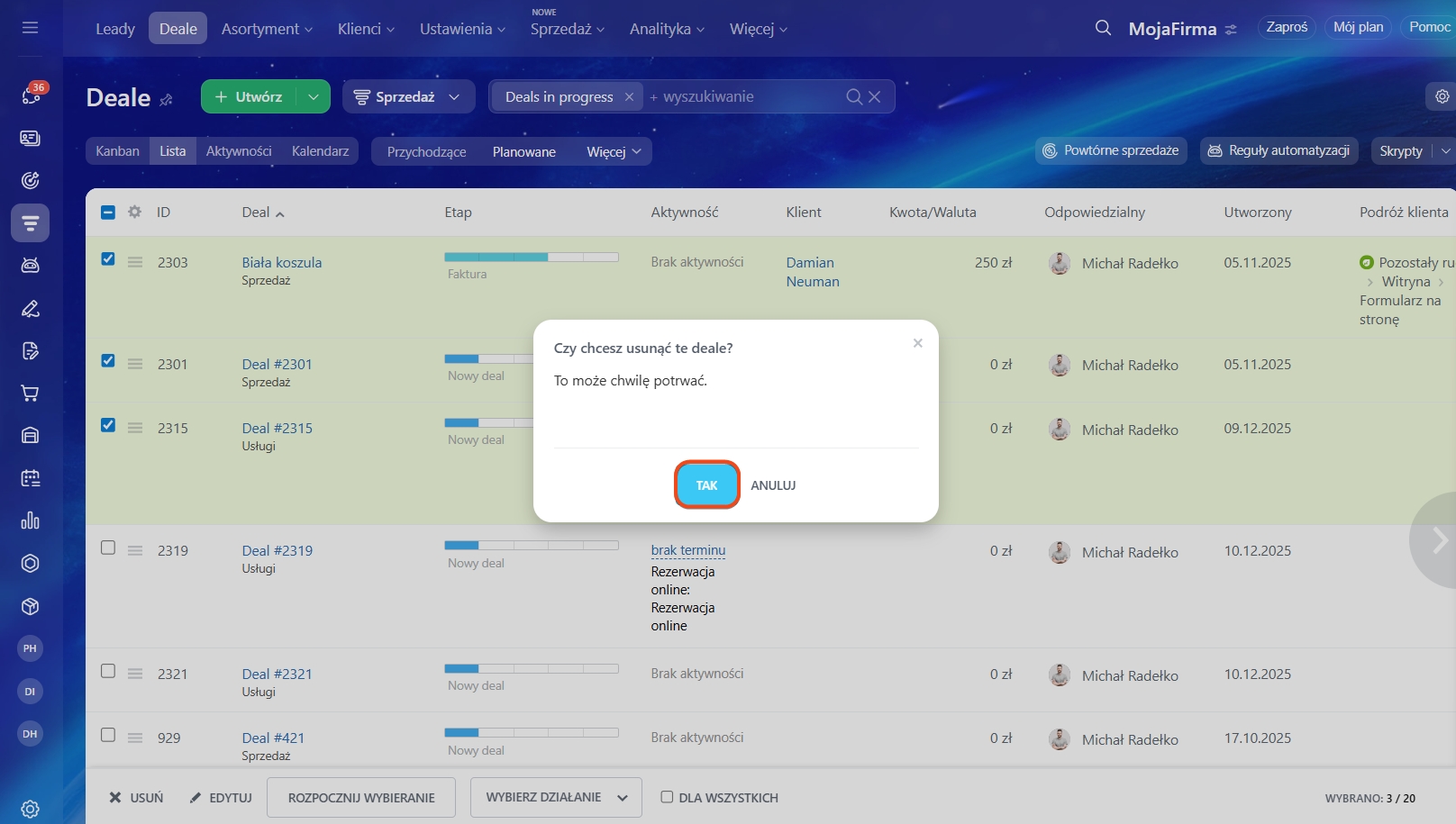 Na liście łatwo zmienisz dane w wielu dealach naraz – np. zmienić etap, odpowiedzialnego czy usunąć nieaktualne rekordy.