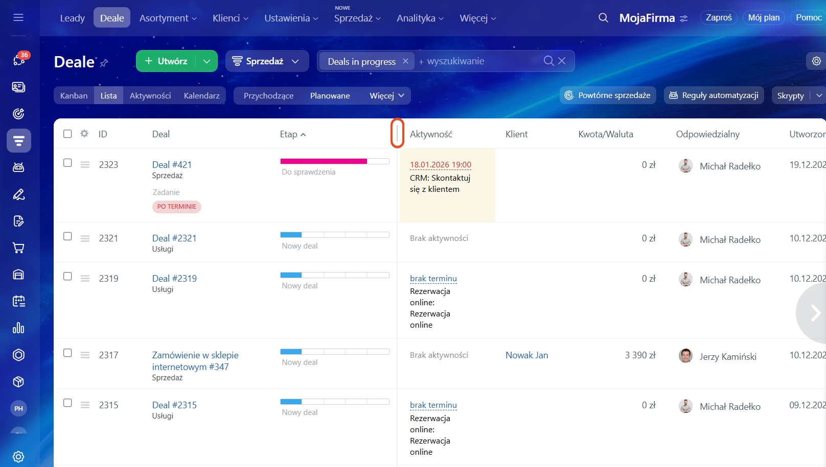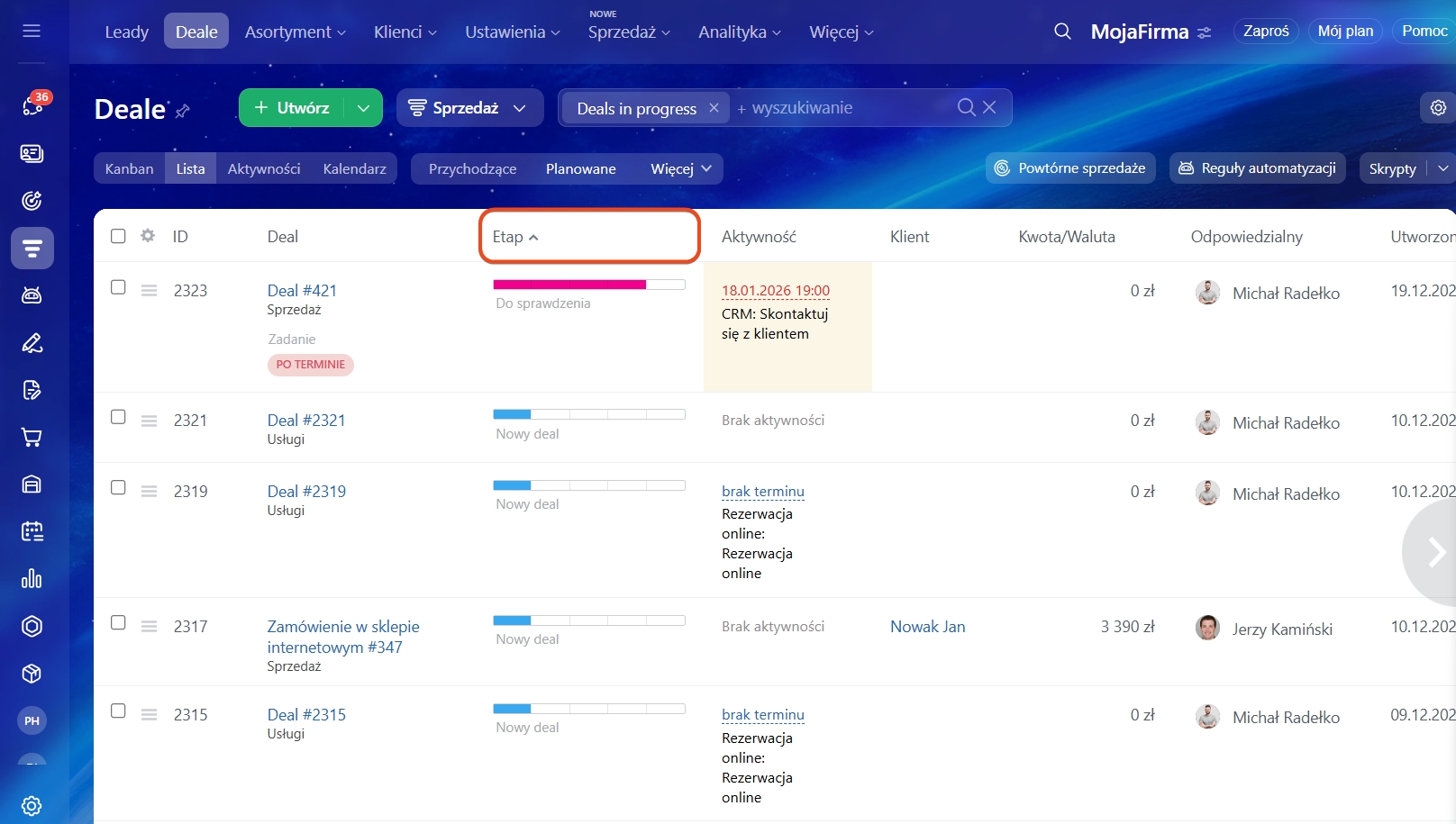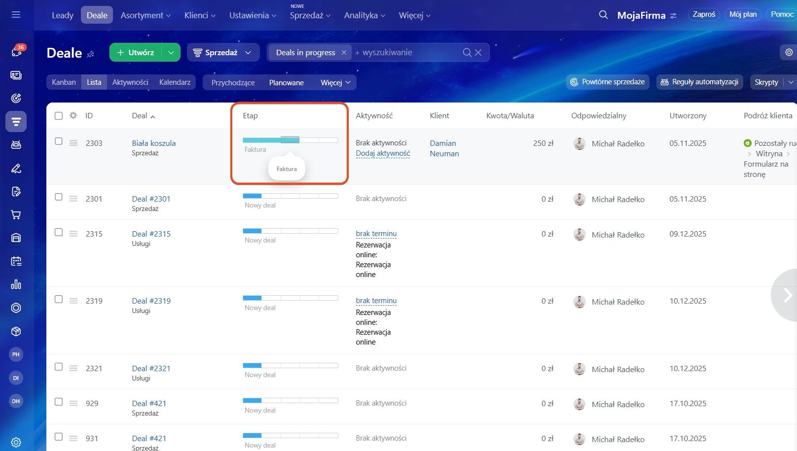 Zmiana etapu deala. Kolumna Etap deala pokazuje aktualny etap w formie paska z etapami lejka sprzedażowego. Aby zmienić etap, najedź kursorem na pasek i wybierz nowy etap – zmiana zapisuje się automatycznie.