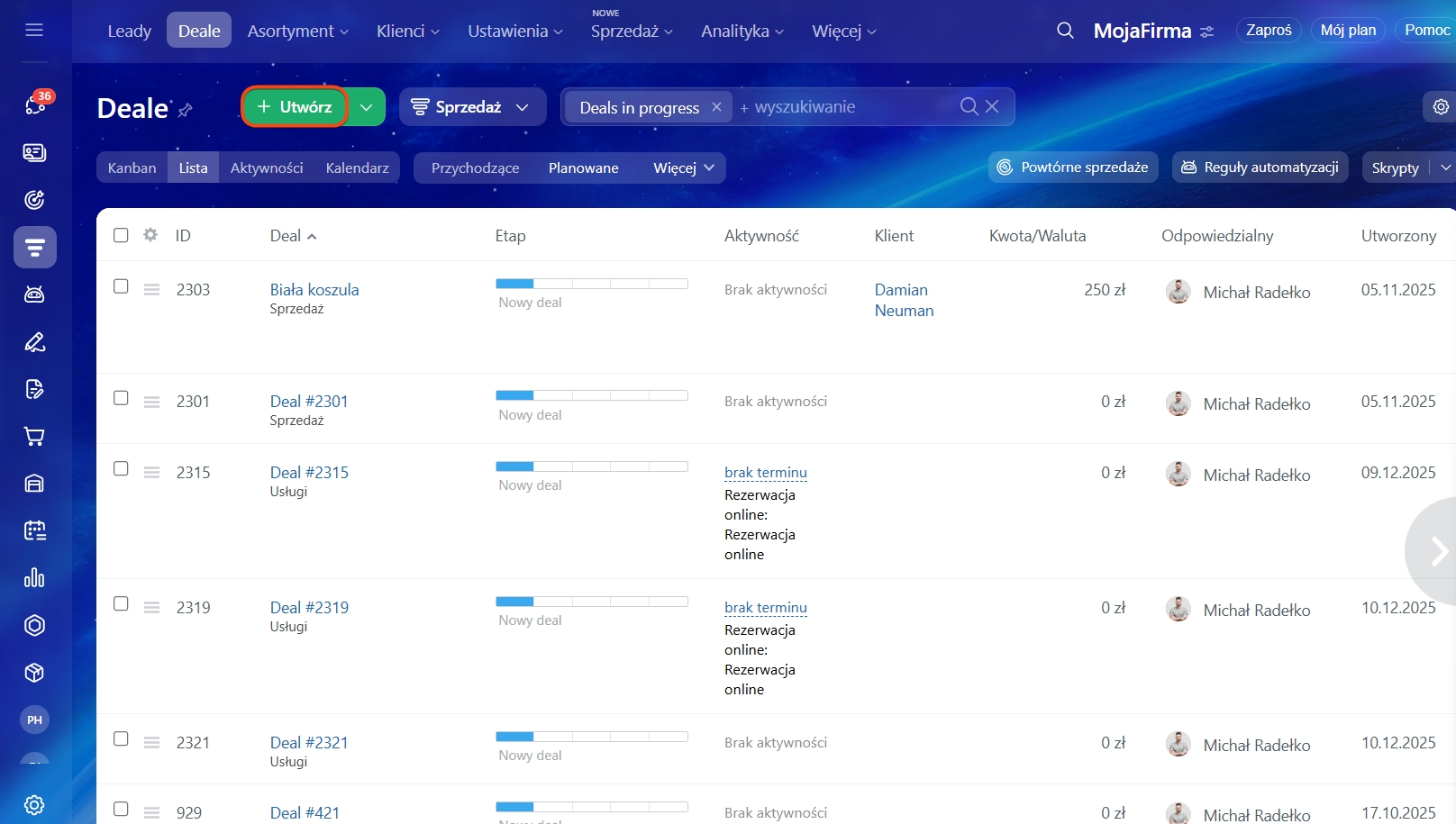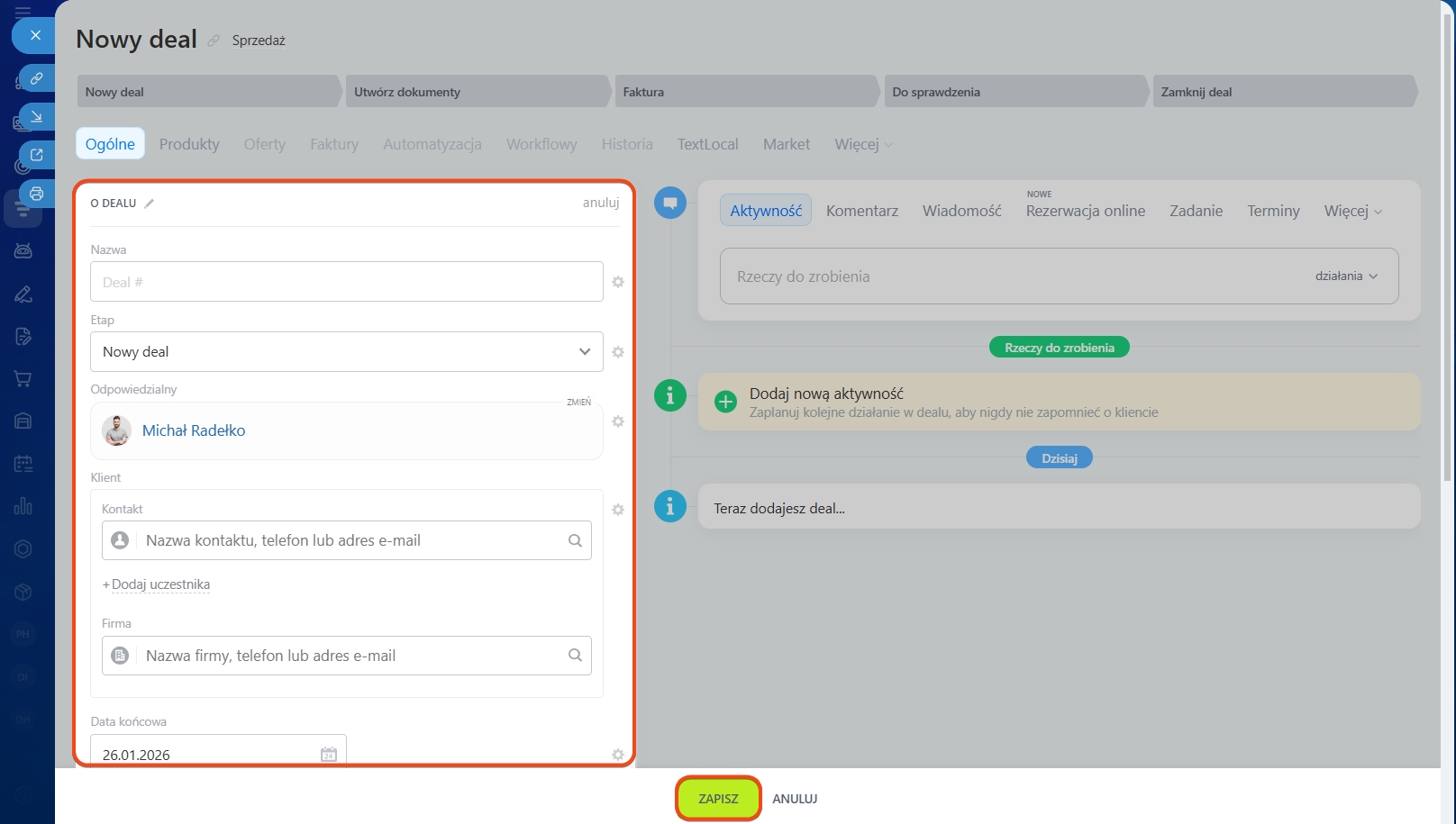 Utworzenie nowego deala. Aby dodać nowy deal do CRM: