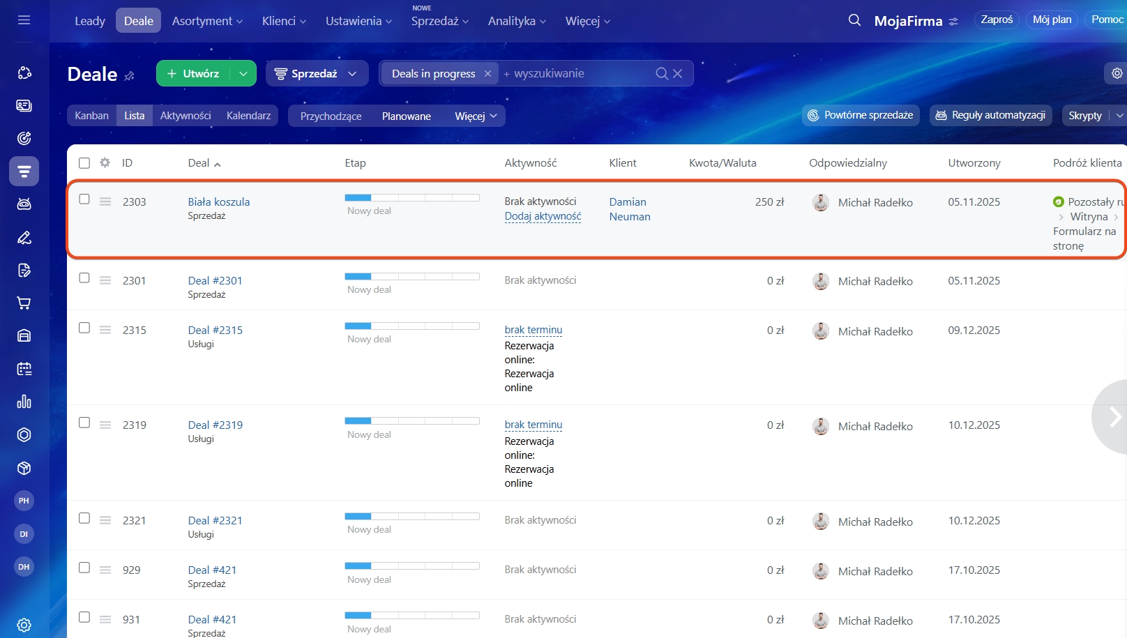 Lista – to widok leadów, deali i innych elementów CRM w formie tabeli, w której możesz wyświetlić potrzebne informacje: nazwę, etap, datę utworzenia, odpowiedzialnego i tak dalej. Jest to bardzo wygodne, gdy chcesz szybko przejrzeć dane i zmienić od razu kilka elementów, bez wchodzenia do każdego formularza.