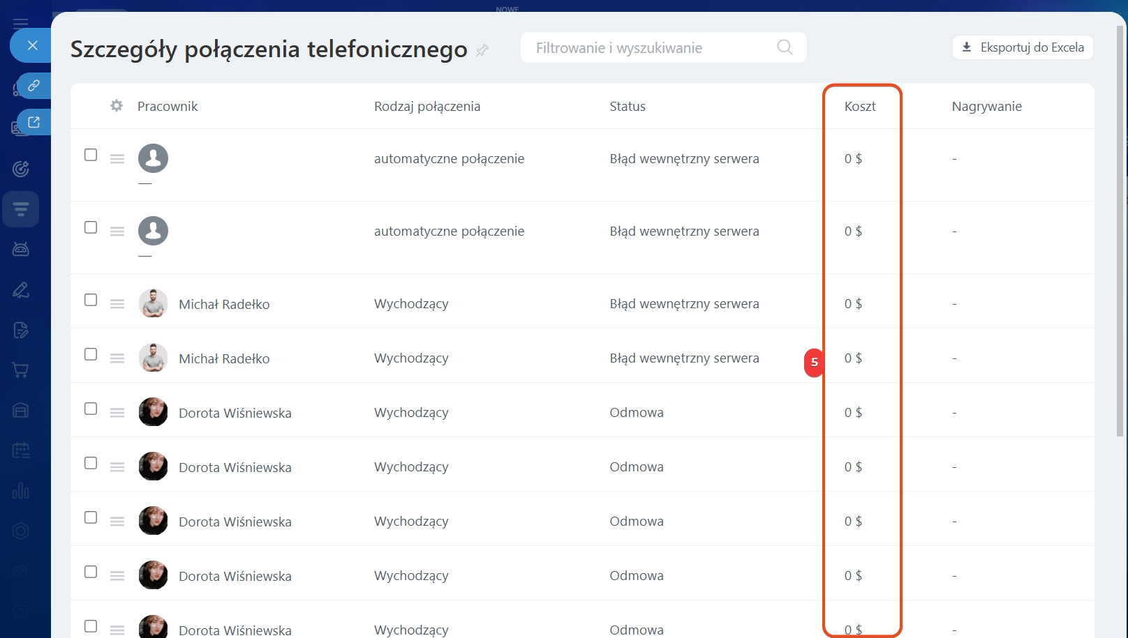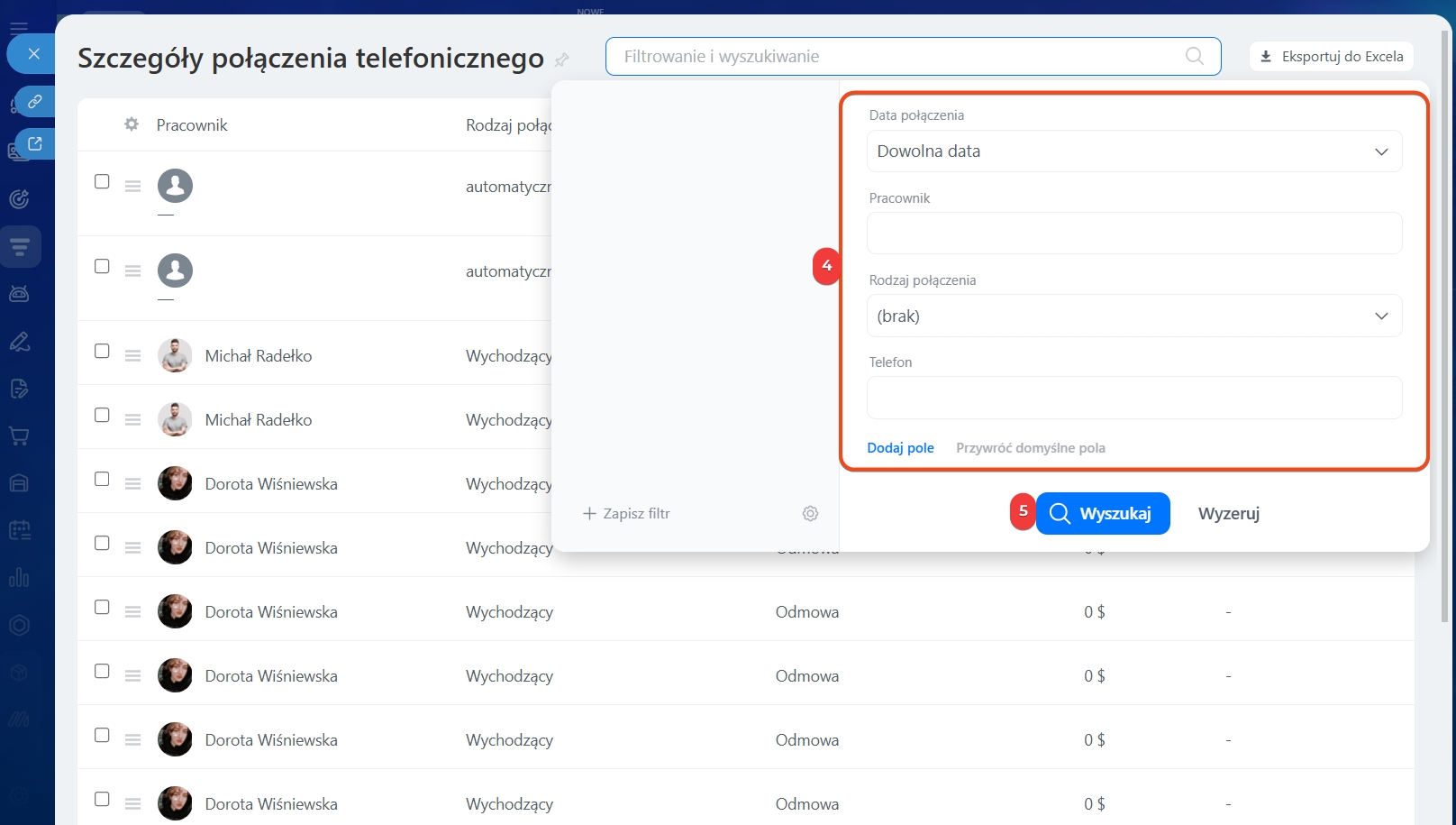 - Status – wybierz Połączenie udane, aby zobaczyć tylko zrealizowane rozmowy.