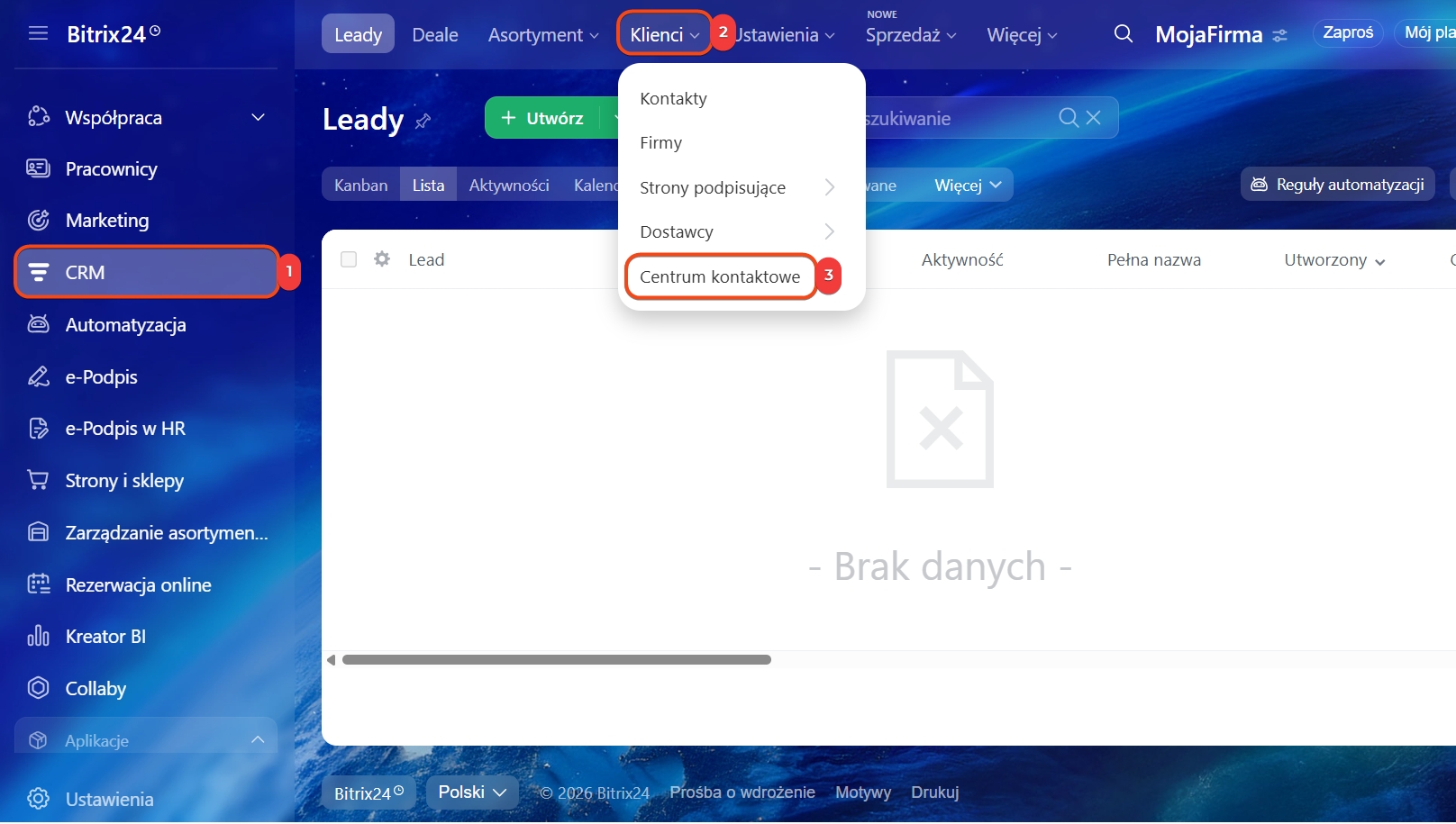 1–5. Otwórz sekcję CRM > Klienci > Centrum Kontaktowe > Telefonia > Podłączenie.