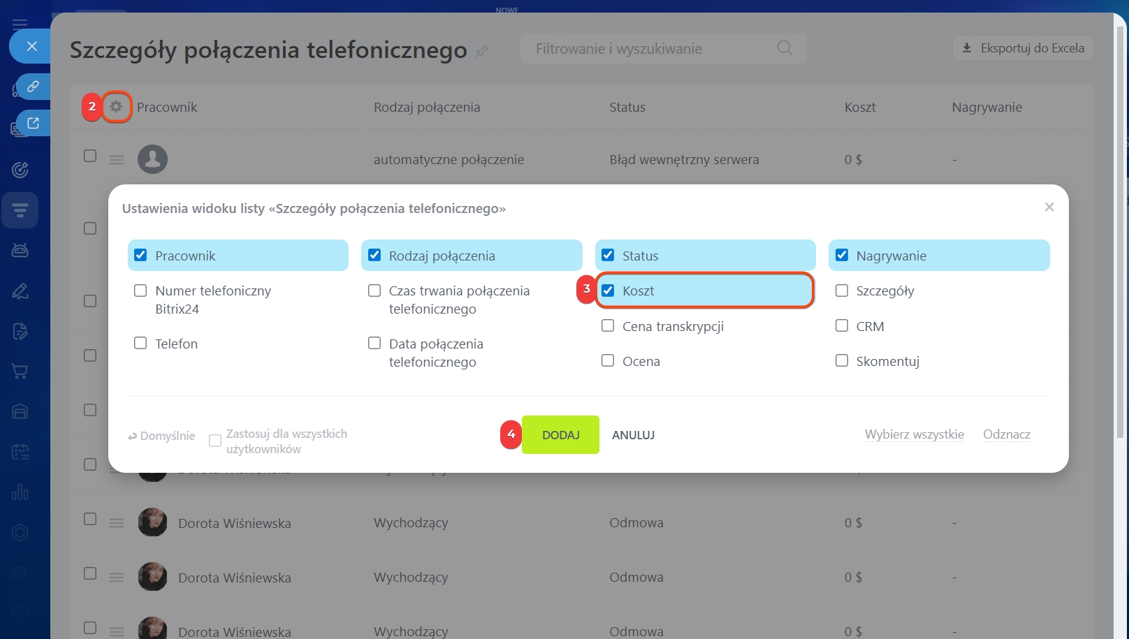 - Aby zobaczyć, ile firma wydaje na połączenia, otwórz Szczegóły połączenia telefonicznego > Ustawienia (⚙️). Dodaj kolumnę Koszt i kliknij Dodaj.