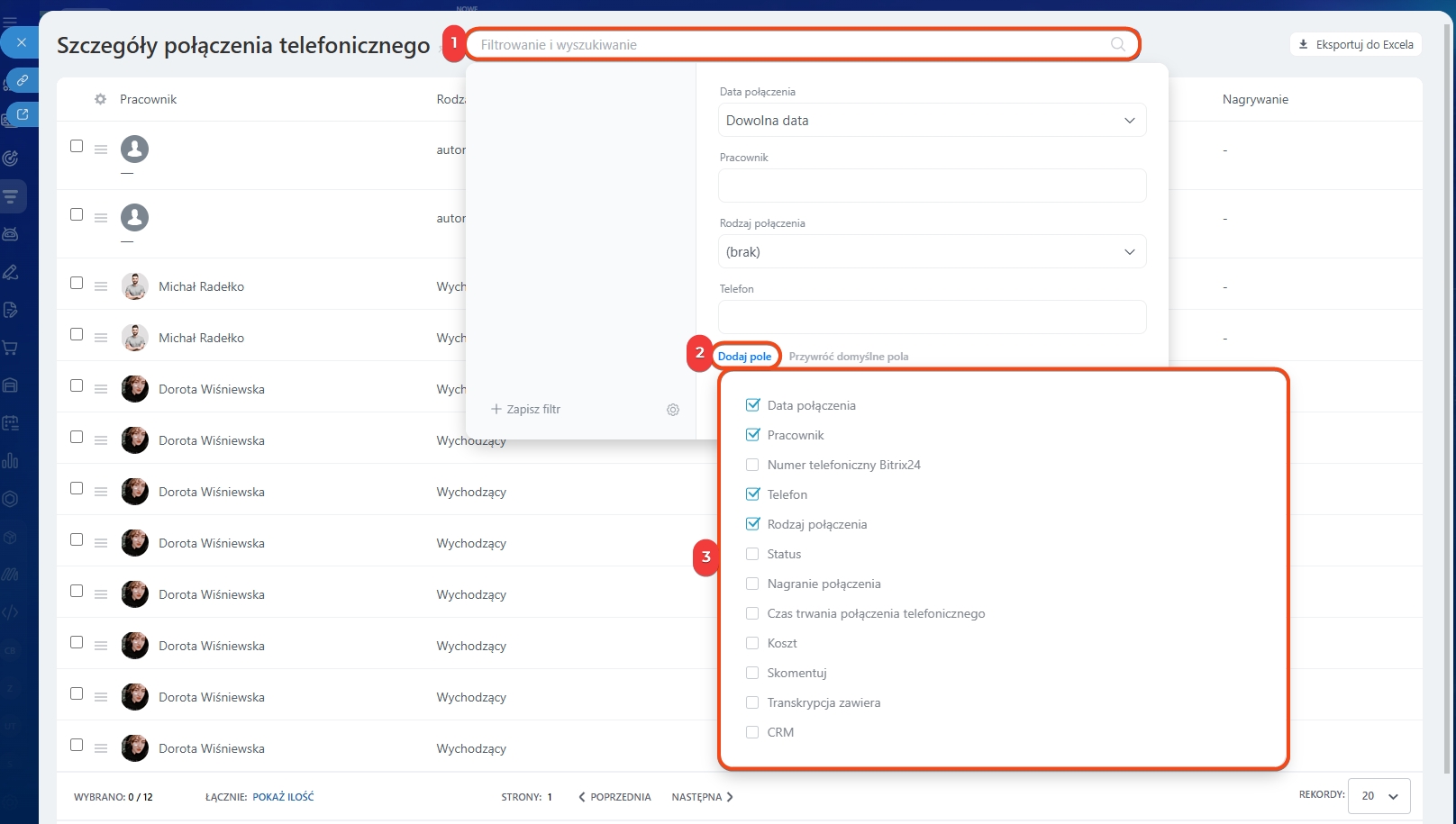 1–3. Kliknij Filtr + wyszukiwanie > Dodaj pole i zaznacz potrzebne pola.