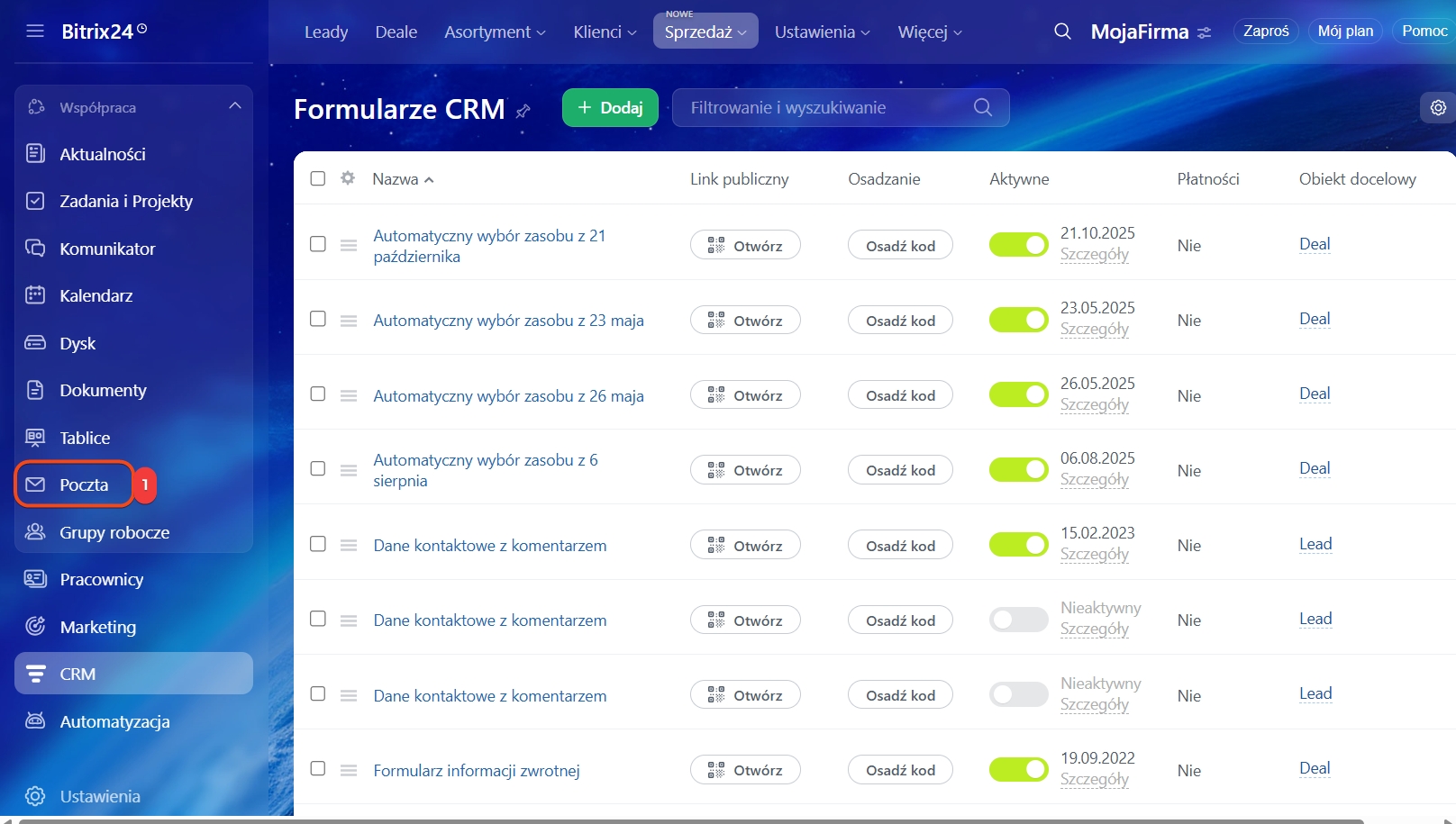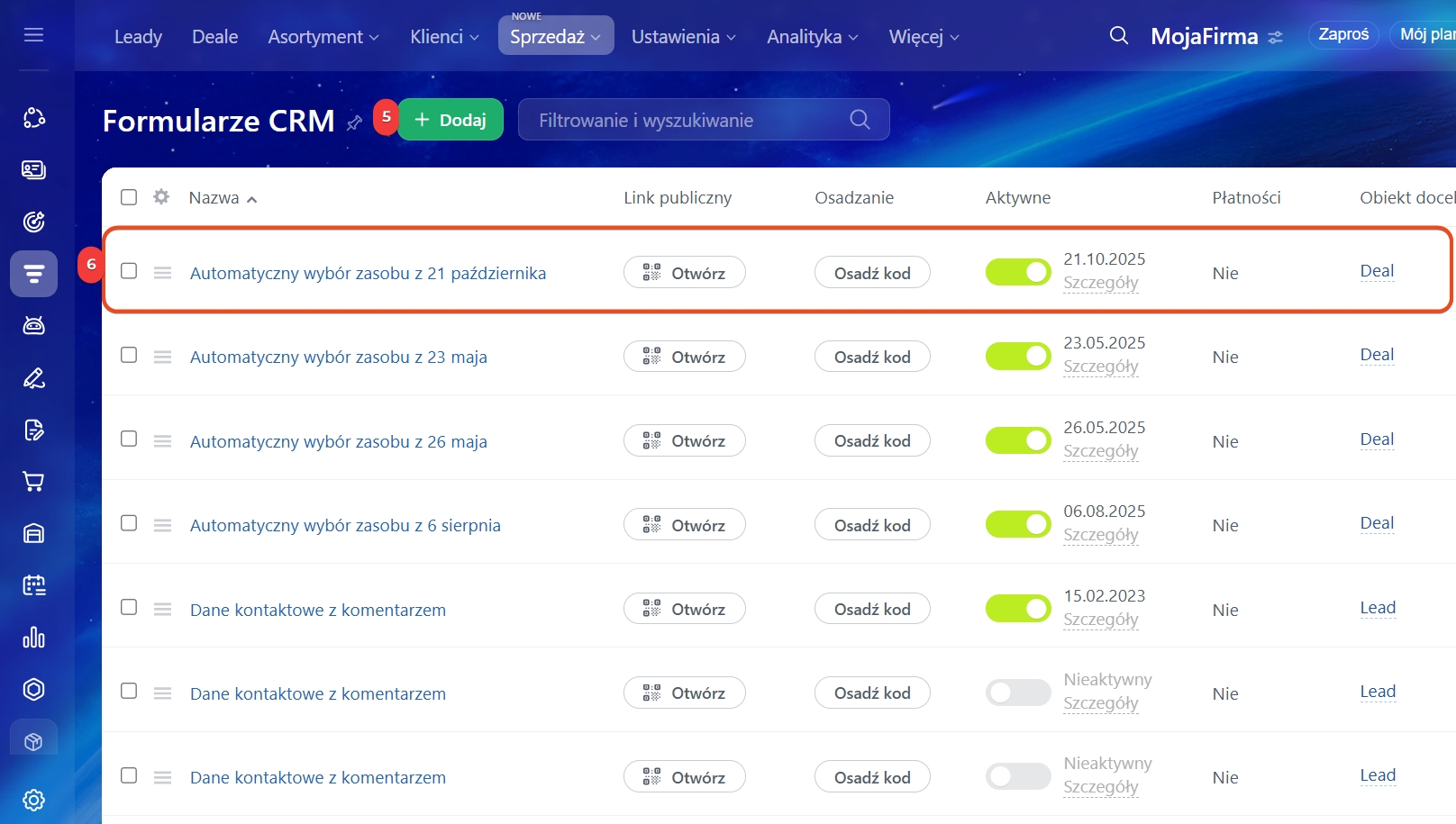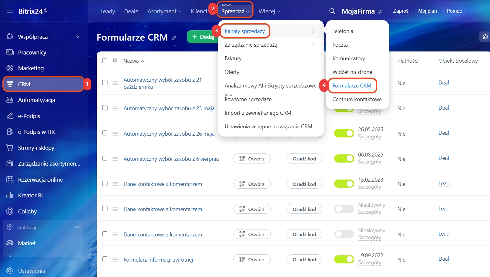 1–4. Przejdź do sekcji CRM → Sprzedaż → Kanały sprzedaży → Formularze CRM.