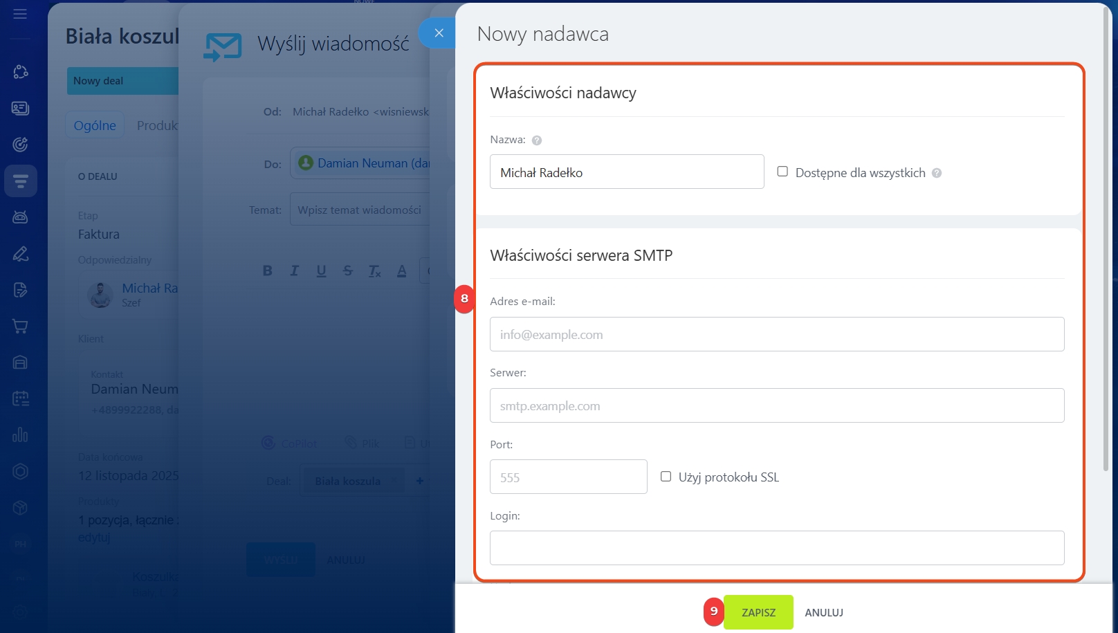 8–9. Wypełnij dane serwera SMTP i kliknij Zapisz.