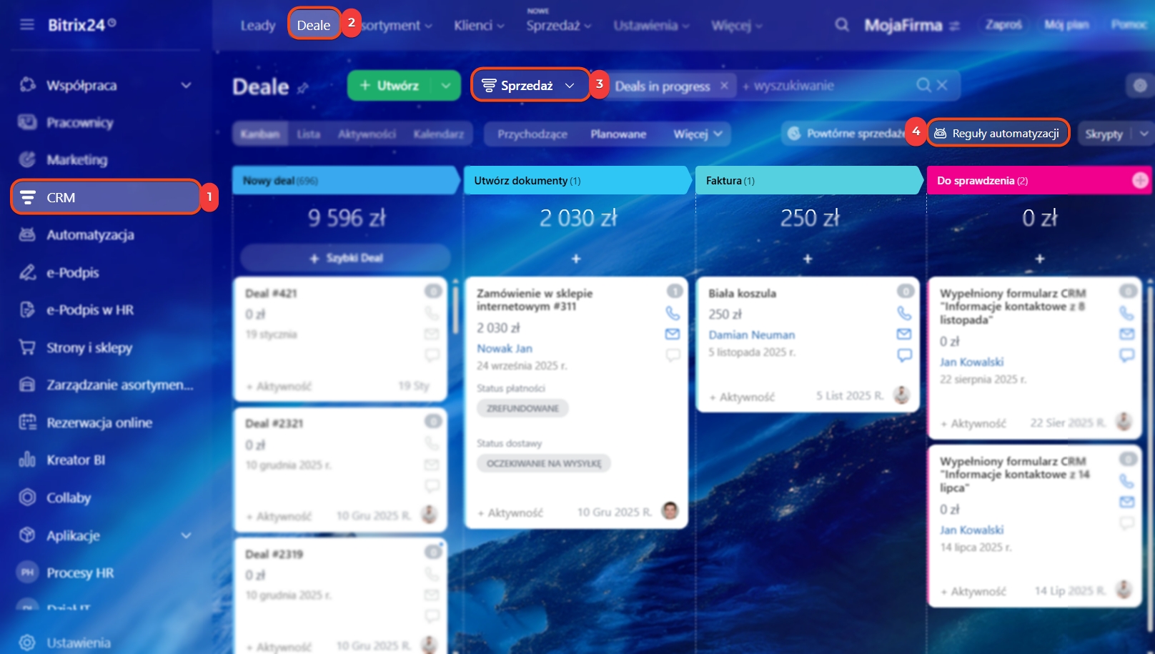1–2. Przejdź do CRM i wybierz odpowiedni element – na przykład Deale.