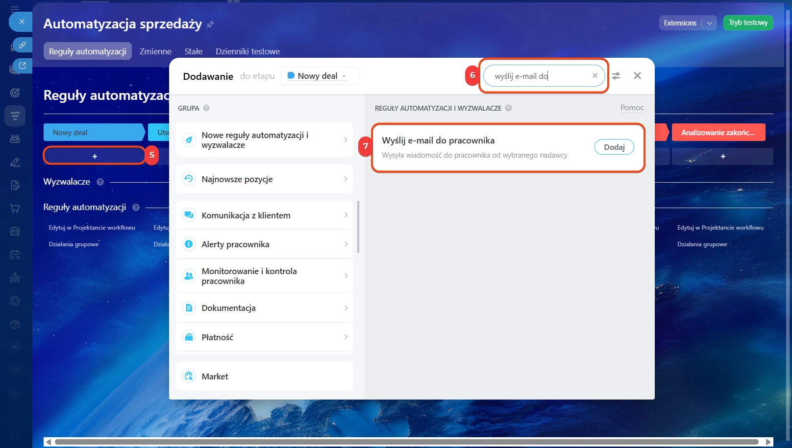 6–7. W polu wyszukiwania wpisz Wyślij e-mail pracownikowi. Dodaj regułę, a otworzy się okno konfiguracji.