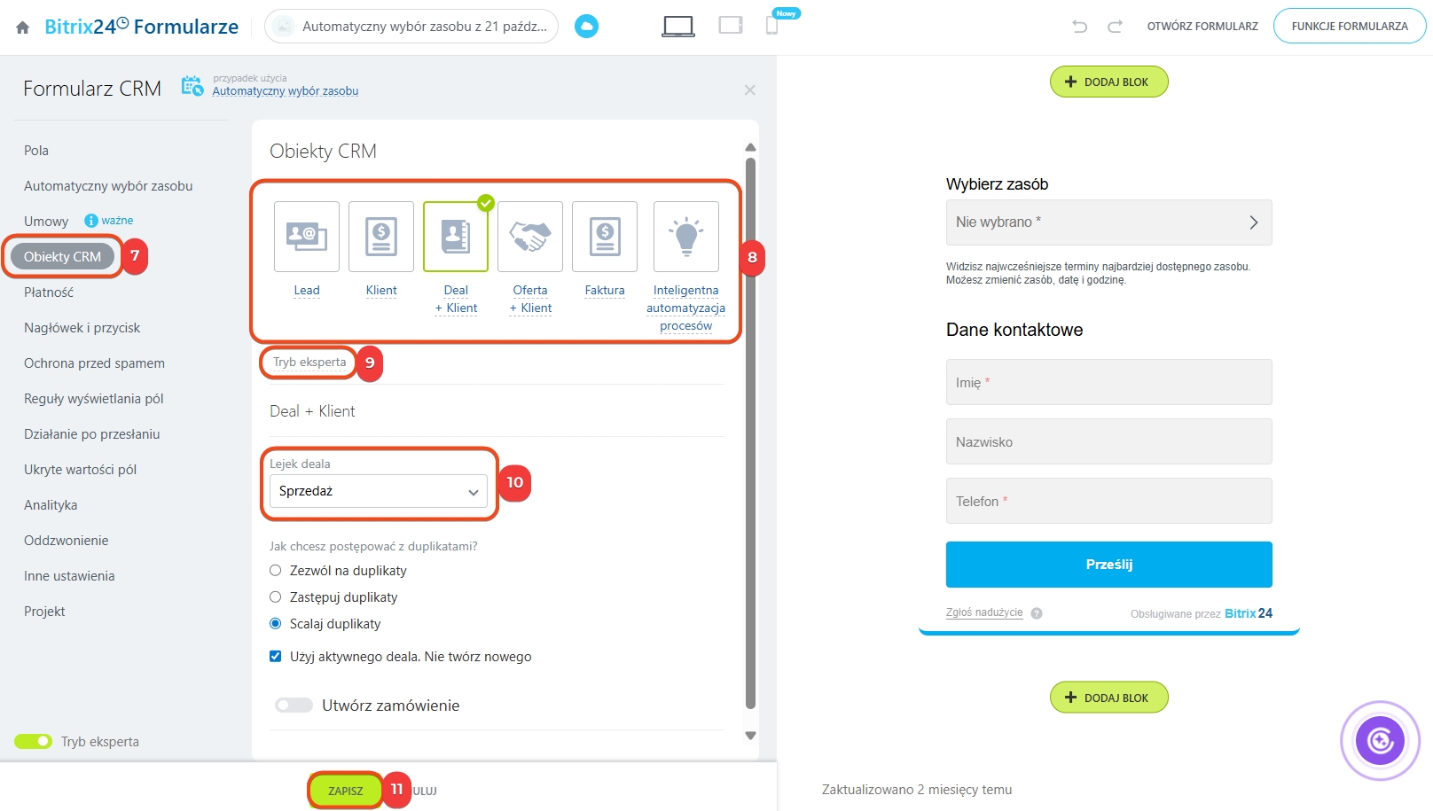 7–8. W sekcji Obiekty CRM określ, które elementy mają powstać po wypełnieniu formularza przez klienta: lead, deal + klient, oferta + klient, faktura lub proces inteligentny.