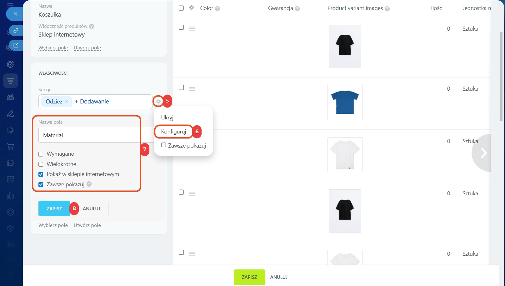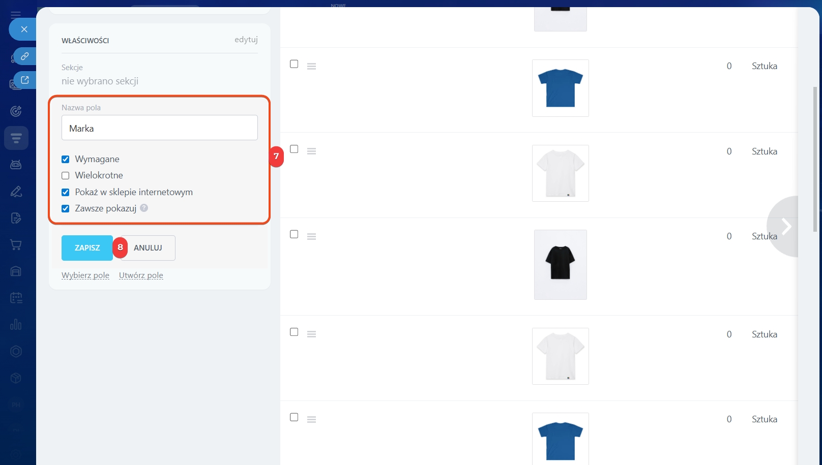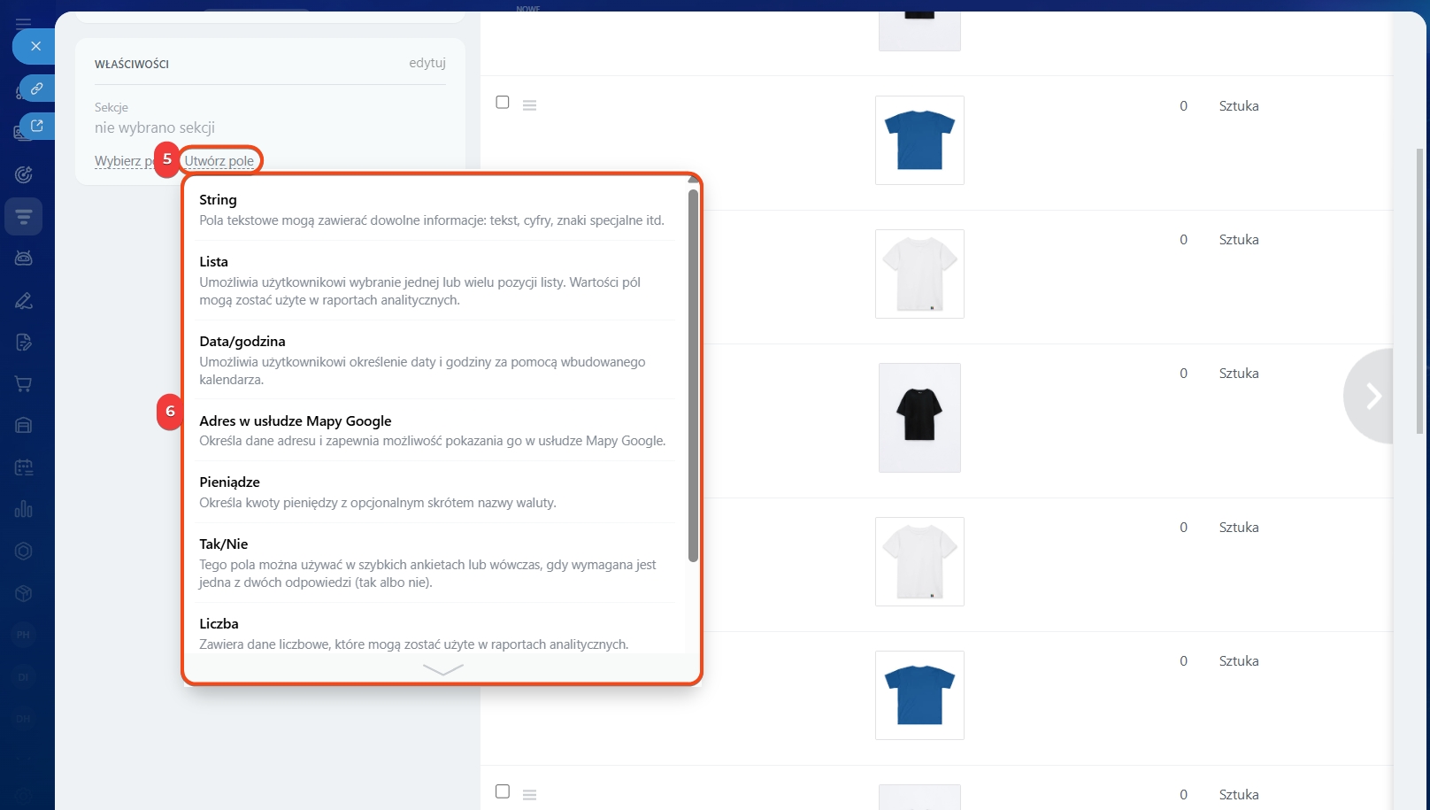 4–6. Otwórz wybraną kartę produktu → kliknij Utwórz pole → wybierz typ pola.
