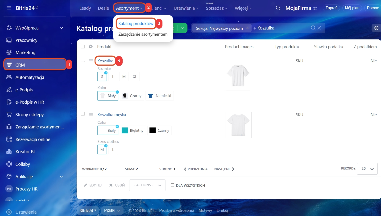1–3. Przejdź do: CRM → Asortyment → Katalog produktów.
