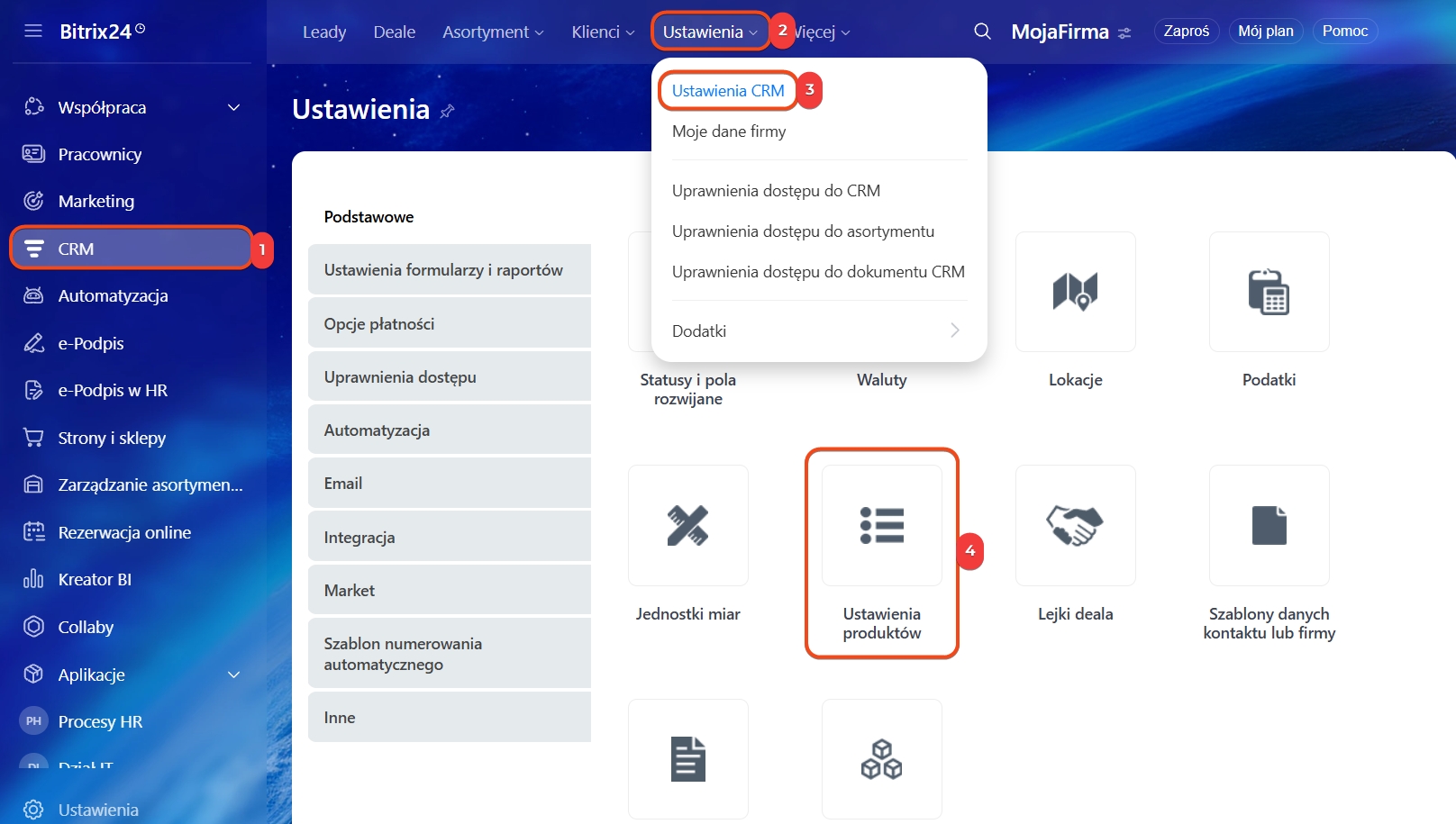 1–4. Przejdź do: CRM → Ustawienia → Ustawienia CRM → Ustawienia produktów.