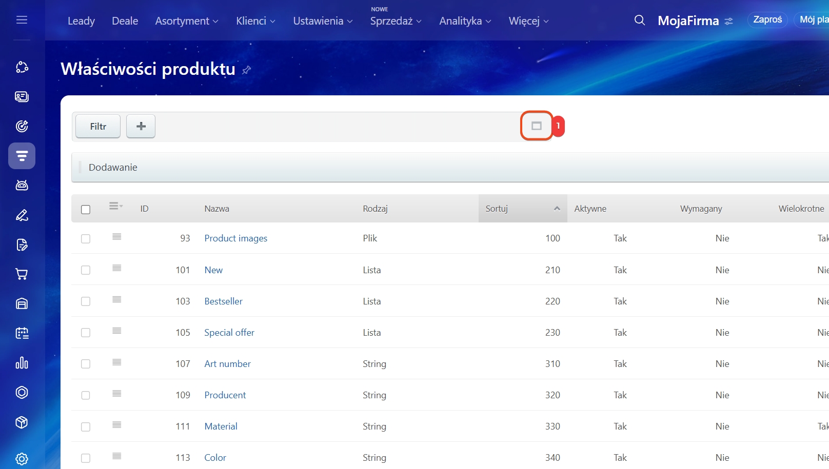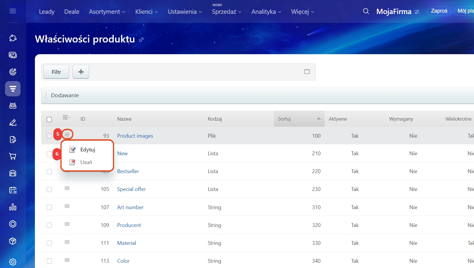 - Edycję właściwości wykonasz zarówno w karcie produktu, jak i w ustawieniach CRM. Usunięcie – wyłącznie w ustawieniach CRM.