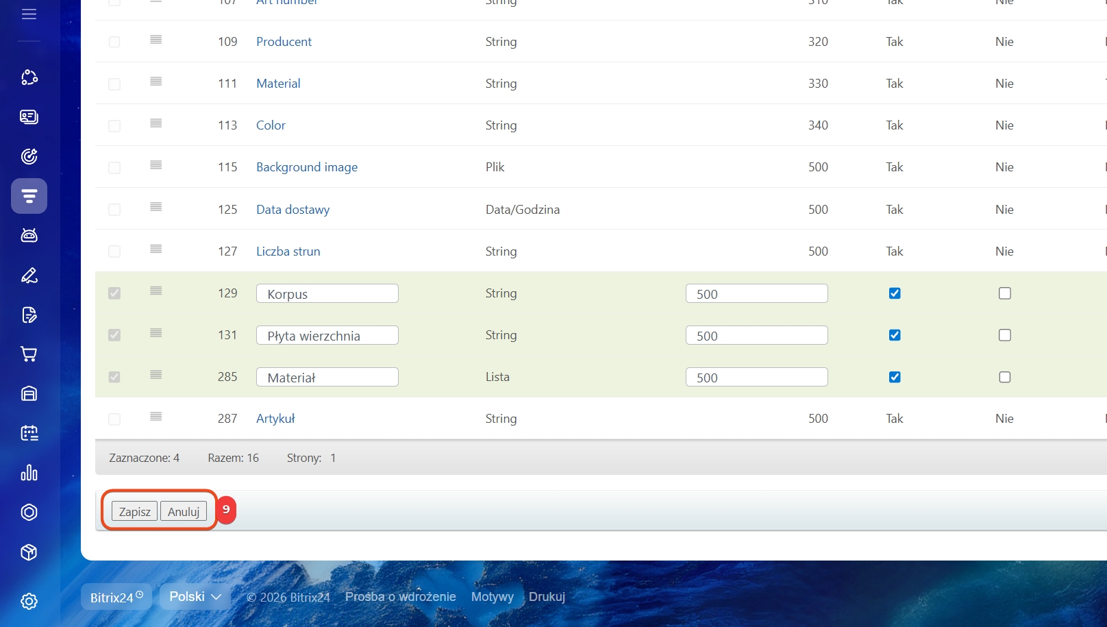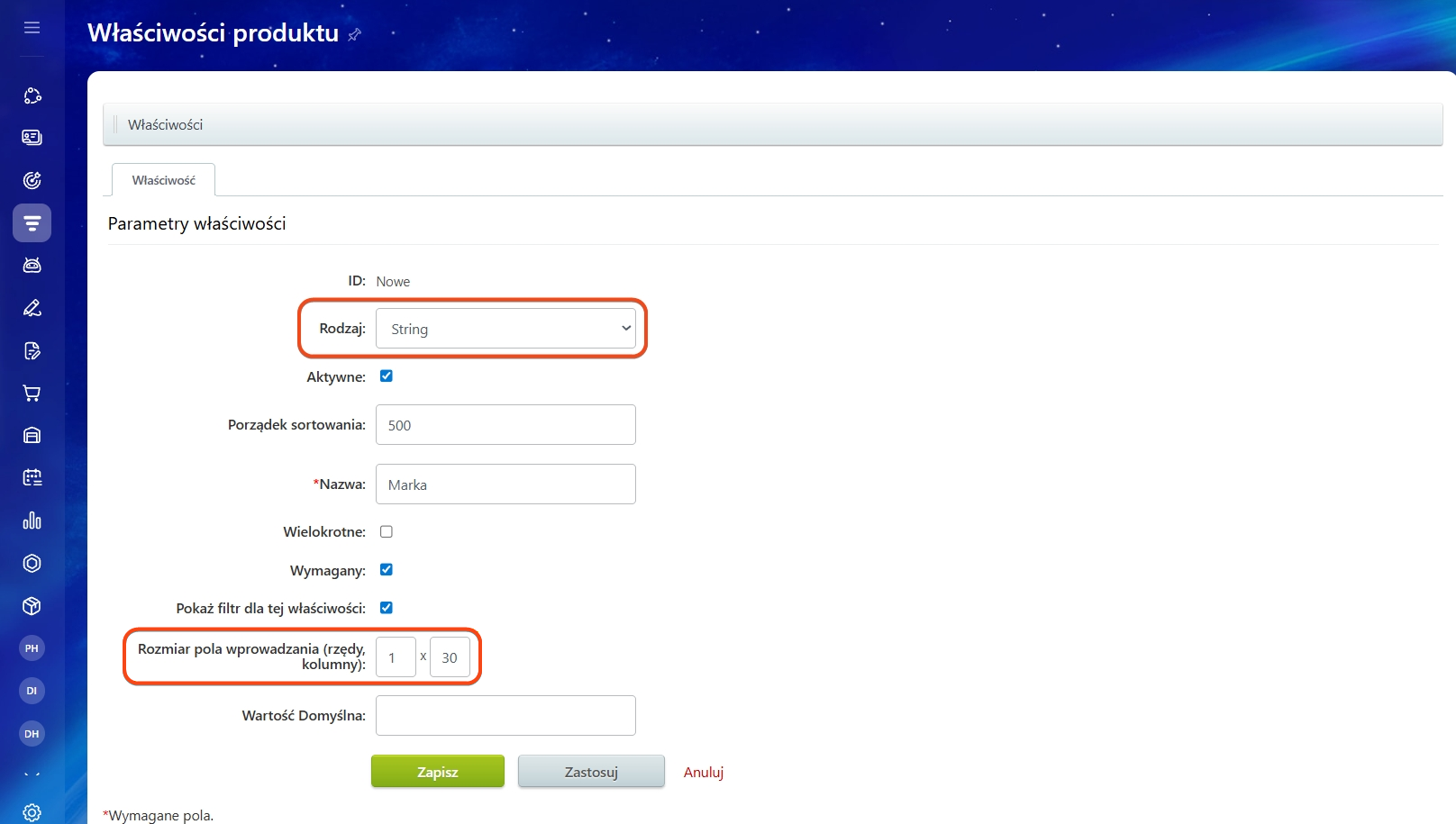 - Wymagane — użytkownik nie będzie mógł zapisać karty bez wypełnienia tego pola.