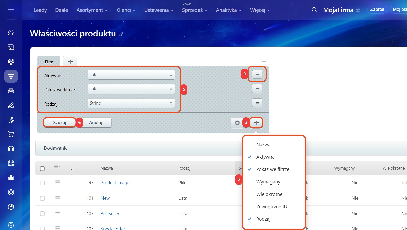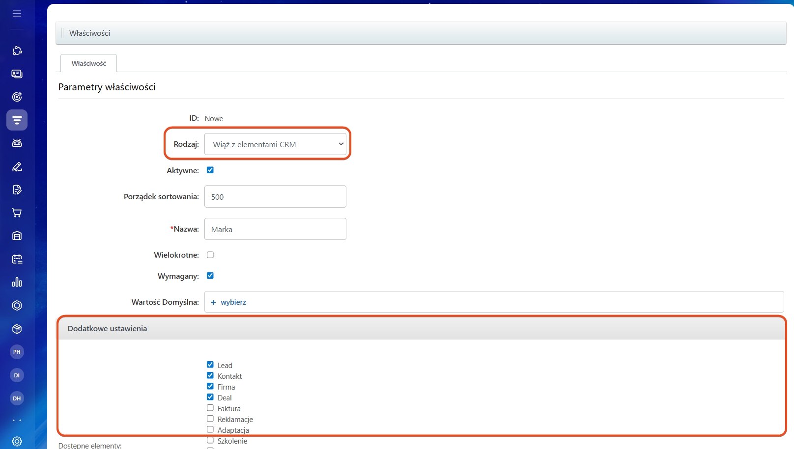 - Pokaż filtr dla tej właściwości — po włączeniu właściwość staje się dostępna jako kryterium filtrowania na listach.