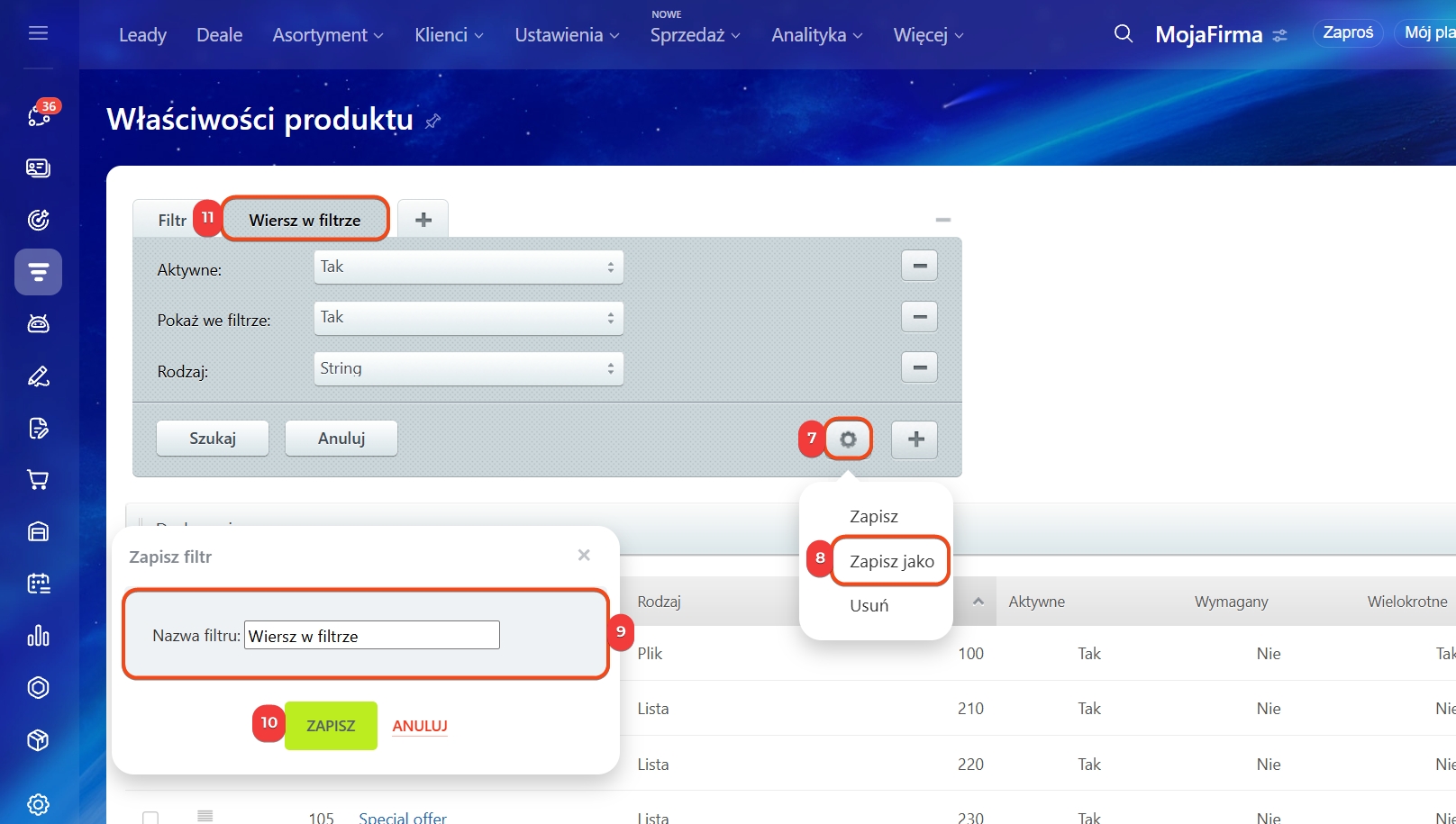 7–10. Aby zapisać filtr do ponownego użytku: Ustawienia (⚙️) → Zapisz jako → nadaj nazwę → Zapisz.